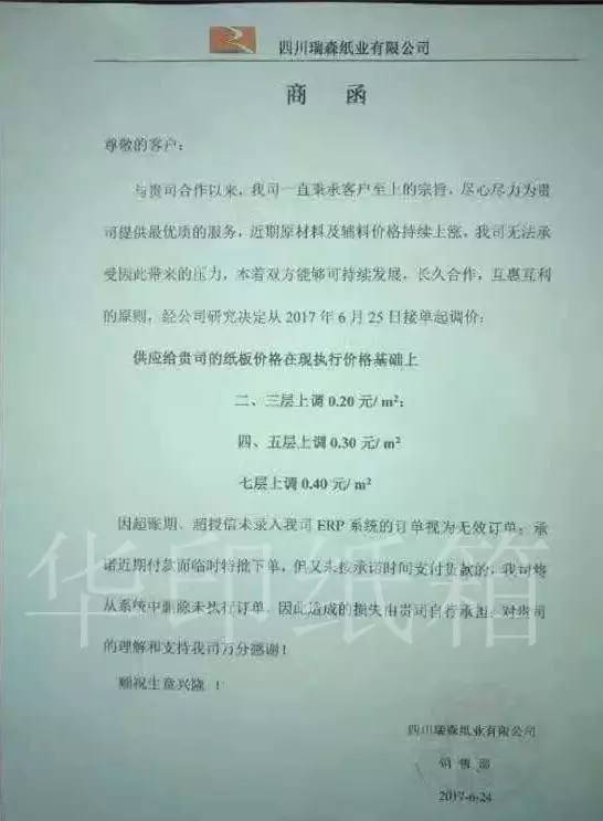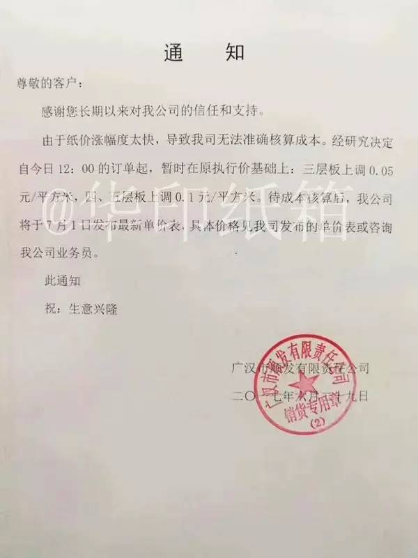 四川省广汉市包装装潢有限责任公司:自2017年6月16日起,三层纸板上涨0.05元/㎡;四、五层纸板上涨0.08元/㎡;委托我司的加工纸箱,基价也按上述标准上调;原纸供应商要求不允许货款超期,否则不予发货,故客户务必按约定账期付款,如有超期未付一律做停单处理。