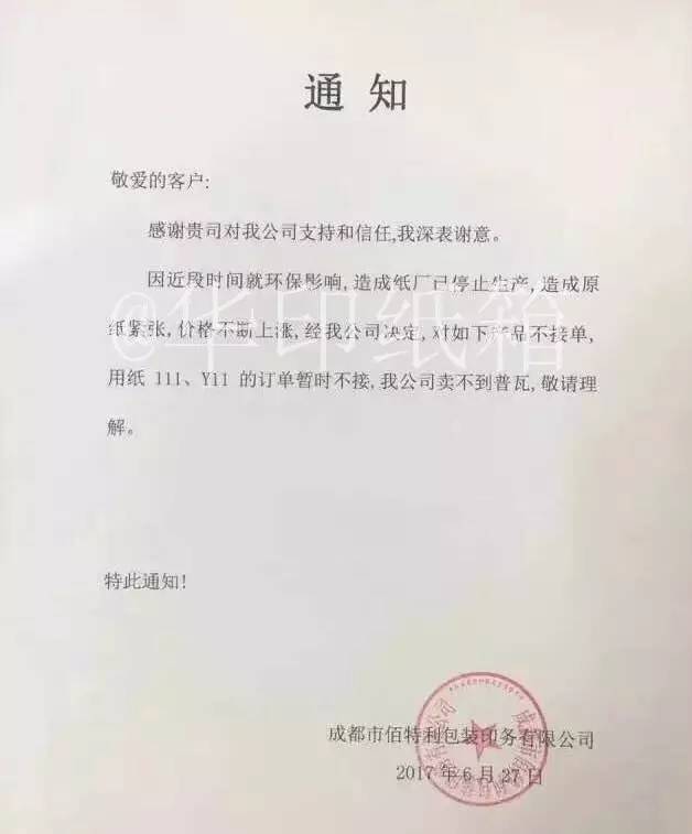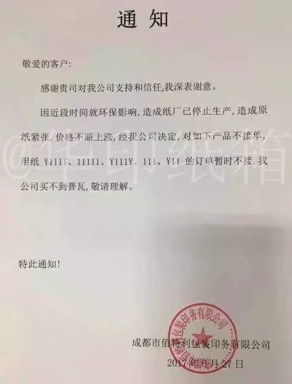 成都市佰特利包装印务有限公司:因近段时间就环保影响,造成纸厂已停止生产,造成原纸紧张,价格不断上涨,经我公司决定:对如下产品不接单,用纸111、Y11的订单暂时不接,我公司买不到普瓦,敬请理解!