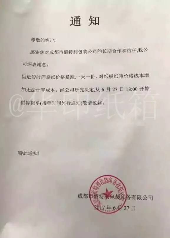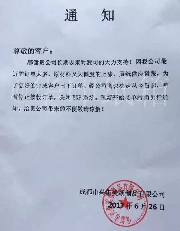 成都世音包装纸品有限公司:由于近期原纸价格持续混乱上涨,我司无法核算成本,故决定自2017年6月22日起系统暂停接单,具体接单时间等待公司确定。