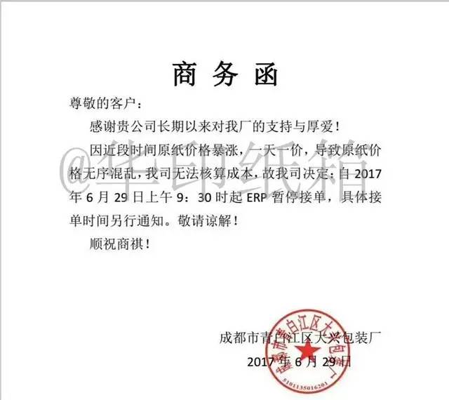 成都市青白江区大兴包装厂:因近段时间原纸价格暴涨,一天一价,导致原纸价格无序混乱,我司无法核算成本,故我司决定:自2017年6月29日上午9:30起ERP暂停接单,具体接单时间另行通知,敬请谅解!