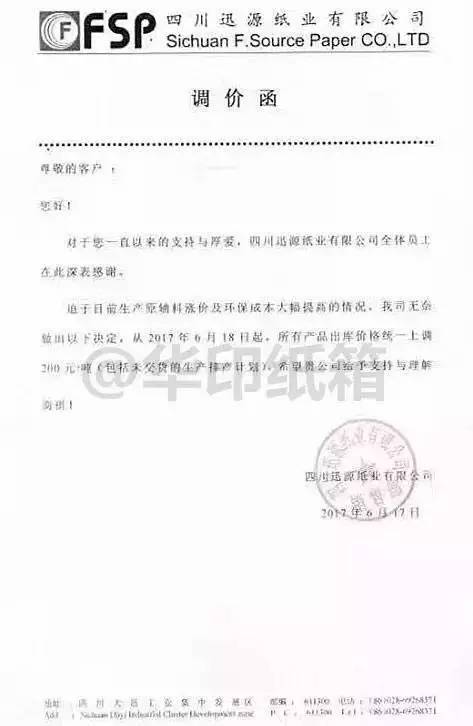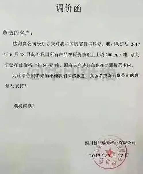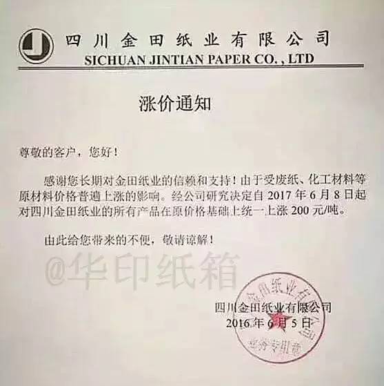 成都市鑫林包装印务有限公司:因近段时间,受各种原纸及辅助材料价格的不断连续上涨,及员工工资提高,造成纸箱成本持续上升。自2017年6月17日起,对纸箱在原来的价格上调20%。