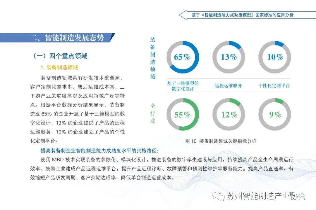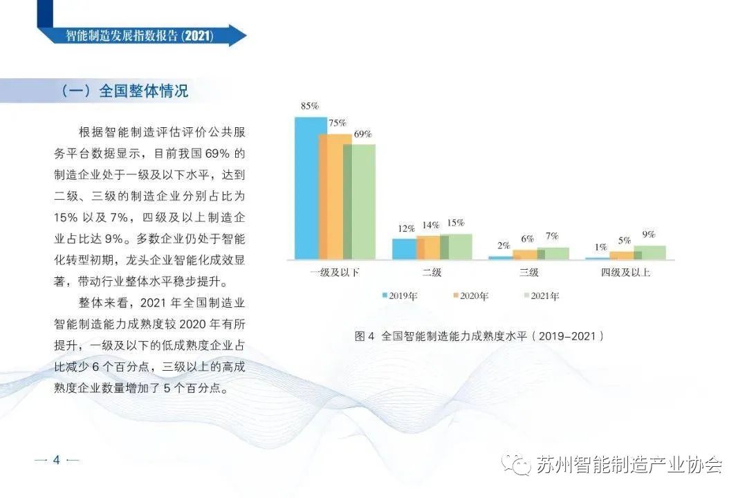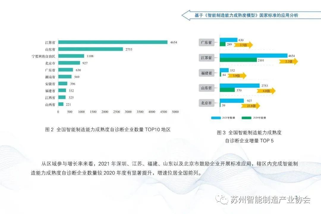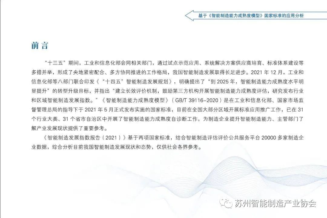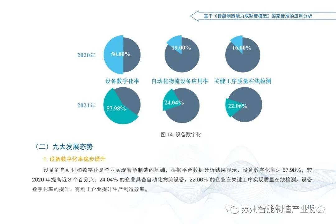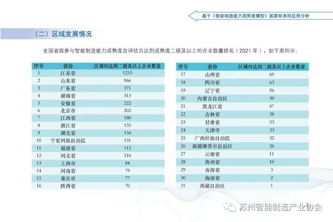 2022年3月,中国电子技术标准化研究院基于2万多家制造企业生产运行数据,研究发布了《智能制造发展指数报告(2021)》,对国内制造业智能化发展情况进行了系统分析和全面展现,多维度展现制造业在设计、生产、物流、销售、服务各环节的关键指标变化情况,直观地反映了2021年制造业的智能制造发展进程,刻画出一幅“中国制造业智能制造发展数据地图”。