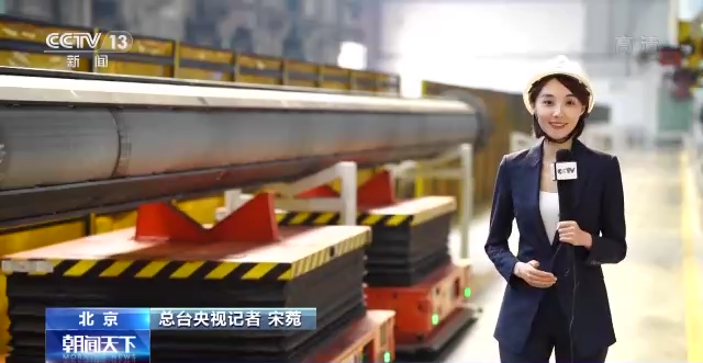 总台央视记者 宋菀:走进5G全覆盖的灯塔工厂,您可以看到双车联动的AGV小车,正在搬运超长超重的钻杆,AGV小车被称为货物搬运“飞毛腿”,在精准授时、低时延的5G无线工业专网的保证下,它可以实现27米超长超重物料的同步搬运和自动上下料。