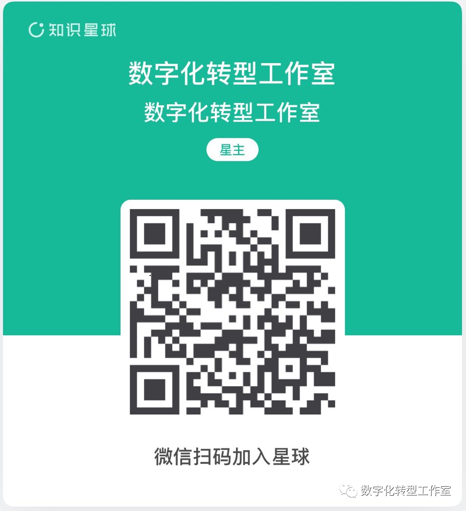 为了知识的沉淀和从业者的精神家园,我们创建了“数字化转型工作室”知识星球,这是数字化转型从业者的网上图书馆,包含了咨询、行业、技术等各种资料。