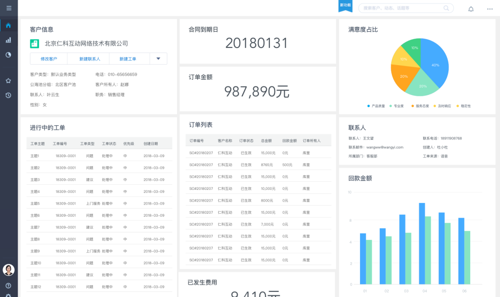 客户信息看板为了提升销售环节的流转效率,迪安诊断借助CRM的商机管理、客户拜访管理、日报周报填写、业绩指标划分等模块,让整个销售流程透明化,管理层通过手机或PC端系统可随时随地发现销售过程中的问题,第一时间调整策略。此外,为了提升企业内部协同效率。迪安诊断将CRM与OA、MDM、LIMS、客服、决策、财务六大系统融合打通,实现企业内部数据一体化管理,解决了数据无法对齐、比对耗时耗力等问题,也提升了企业内部的协同管理能力。迪安诊断在信息化、数字化领域的积累和升级,不仅提升了企业日常检测业务的效率和质量,也在“疫情防卫战”中实现快速介入、精准服务,发挥了不可替代的作用。过去的一年,不论湖北、温州、北京,还是东北、新疆、青岛……只要有疫情出现的地方,就有迪安诊断的身影。陈雷坦言,参与到新冠检测中,更多的是企业责任的考量。事实也的确如此,核酸检测项目对于医学检测机构来说成本不小,试剂盒、人工费、防护服、仪器等消耗大,而暴涨的核酸检测业务,反而影响到主营业务的推进。不过,在疫情反复的背景下,以及“守护国人健康”的理念指导下,迪安诊断未来也绝不会缺席。而销售易也将伴随迪安诊断,通过不断优化产品、提升服务,用更智能、更便捷的客户管理系统,为医学检验行业快速发展提供新动能。