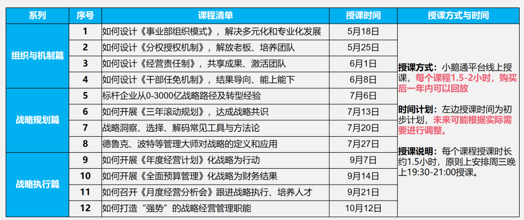课程进度匹配企业经营管理节奏(具体进度如下图),5-10月线上直播授课,支持企业团队在干中学、在学中干,学以致用。