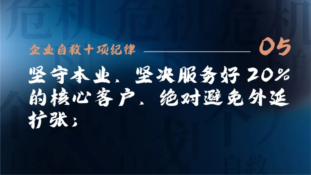 ??自救纪律5:坚守本业,坚决服务好20%的核心客户,绝对避免外延扩张。