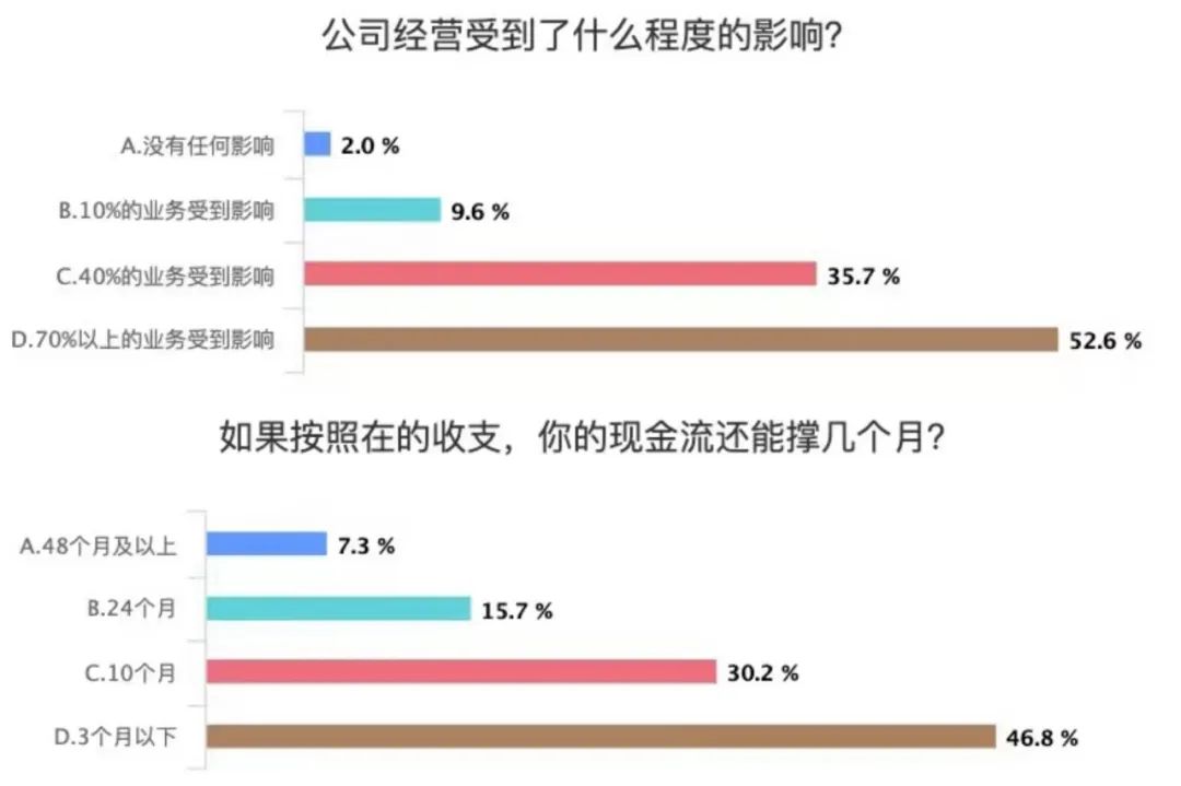 痛了就要大声叫出来,也许会有人来救你。春暖花开拼才智,天寒地冻拼人品。文/ 吴晓波(微信公众号:吴晓波频道)企业,尤其是中小企业的难,是用眼睛和数据都看得到的。有一家民间机构对上海的近千家中小企业主进行了电话调研,结果显示,有九成企业主选择“放弃”。吴晓波频道对1100名企业家学员也进行了问卷调查,我们得到的数据没有那么悲观,不过认为公司经营受疾情影响的程度超过40%以上的,也高达89.3%。而有46.8%的企业,它们的现金流只能支撑三个月。