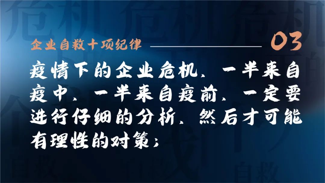 ??自救纪律3:疫情下的企业危机,一半来自疫中,一半来自疫前,一定要进行仔细的分析,然后才可能有理性的对策。