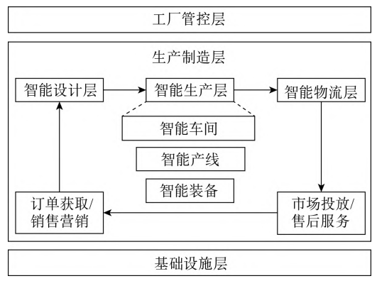 由于企业对供应链的各个环节需求不同,着重点也不同,不同行业的制造流程既有共性特征,又有个性特征,企业应以构建技术竞争优势和提升经济效益为着重点,根据自己的实际情况建设智能工厂。为便于企业灵活高效地将智能化改造转化成为最大生产力,本文的模型基于著名的业务流程管理学者 August- WilhelmScheer 所提出的工厂体系架构构建,分为基础设施层、生产制造层、工厂管控层 3 个层级。生产制造层从订单获取到市场投放,又分为智能设计层、智能生产层、智能物流层 3 个层级,其中智能生产层是落实智能化改造的重要载体,进一步细分为智能装备、智能产线与智能车间 3 个部分( 见图 3) 。