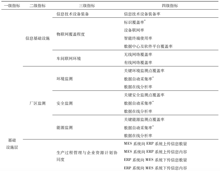 基础设施层是模型的最底层,是生产制造层与工厂管控层的支撑,主要由 4 个二级、12 个三级、33 个四级指标构成( 见表 2) 。信息基础设施、厂区监测、企业内部协同和企业间协同 4 个二级指标分别主要对工厂的信息化、绿色化、协同化进行评估。