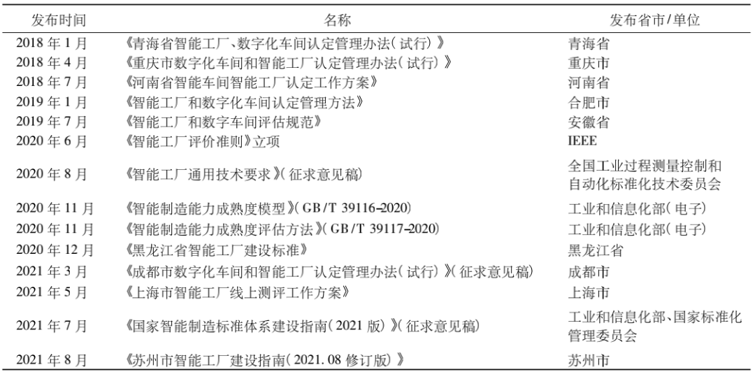 为响应国家战略,不断加快推进数字化信息技术与现代制造业的深度融合,加快促进产业转型升级,我国各省市及单位纷纷发布智能制造成熟度评估标准( 见表 1) 。