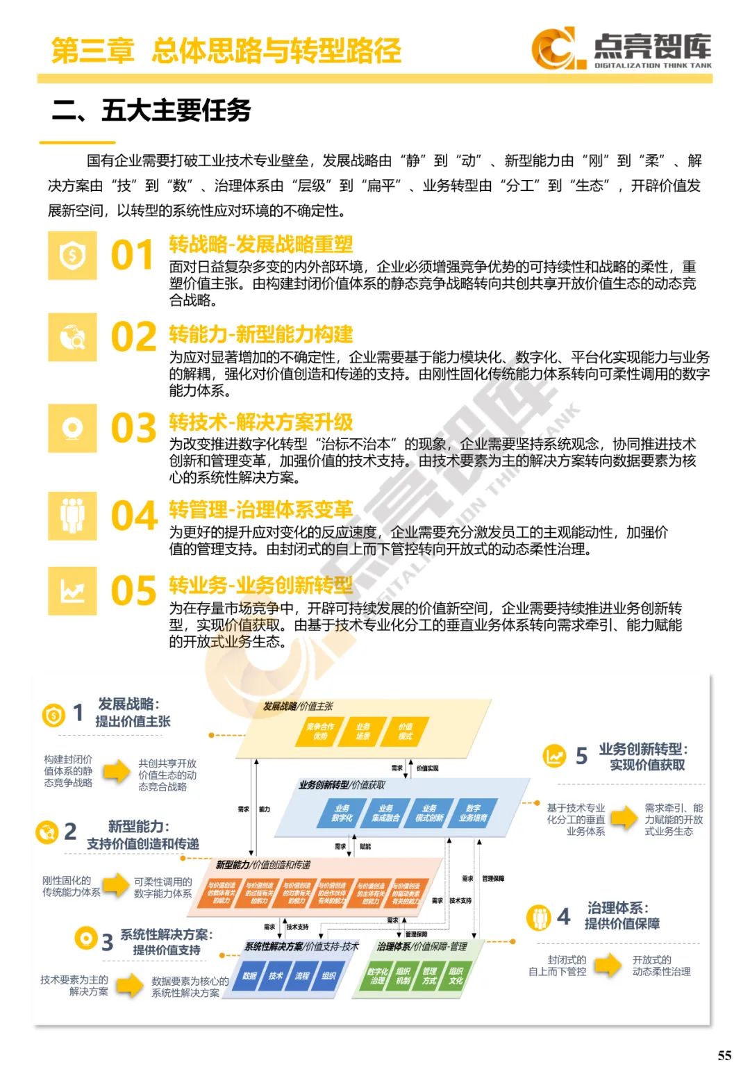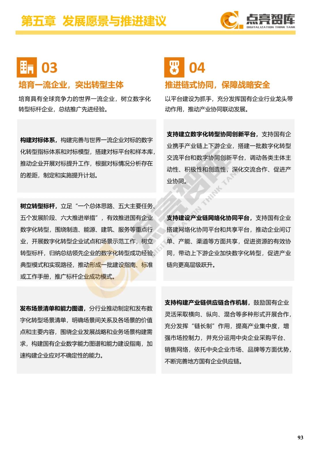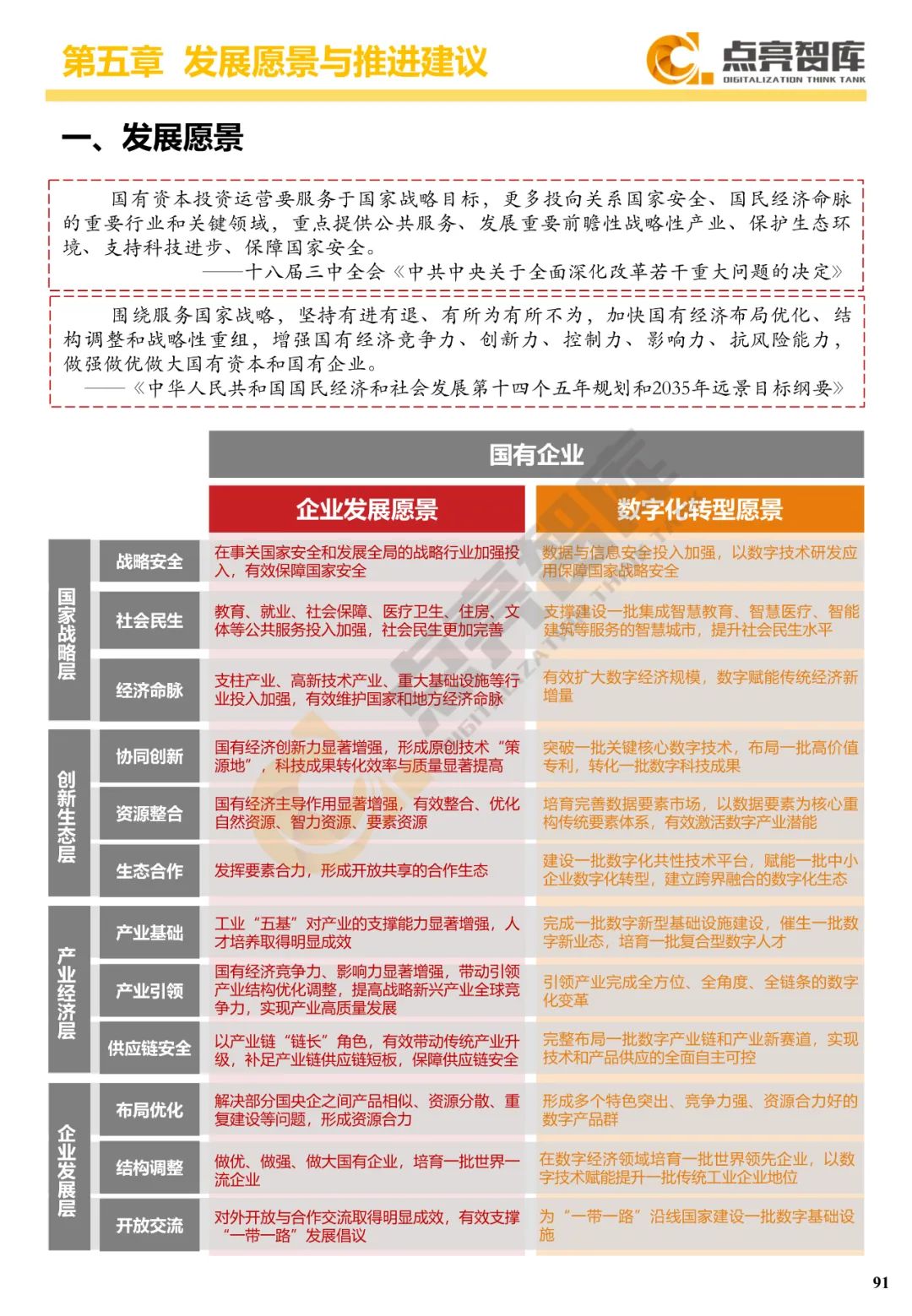 五是从国家战略、创新生态、产业经济、企业发展等4个层面提出12条国有企业数字化转型愿景,并为政府提出强化科技创新、夯实产业基础、培育一流企业、推进链式协同、优化产业体系、加速人才培养、构建数字生态7个方面建议,以推动国有企业由工业时代引领者转变为数字时代领航者,为构建新发展格局、全面建设社会主义现代化国家作出新的更大贡献。