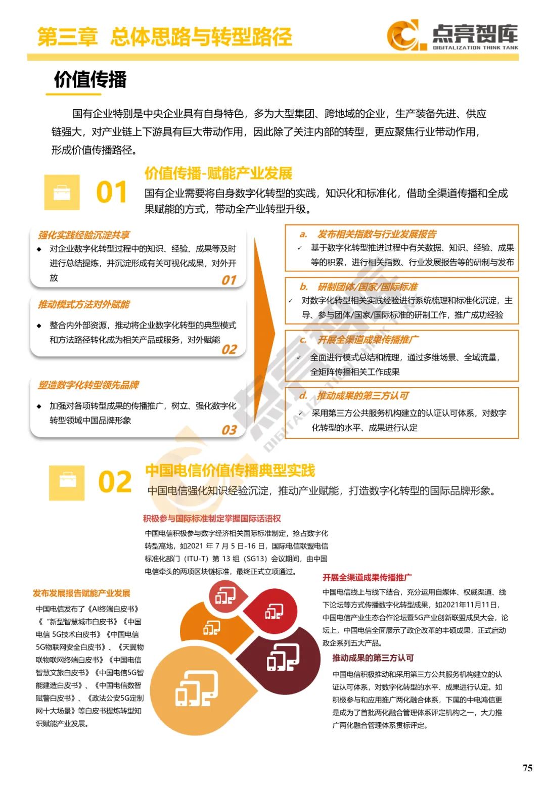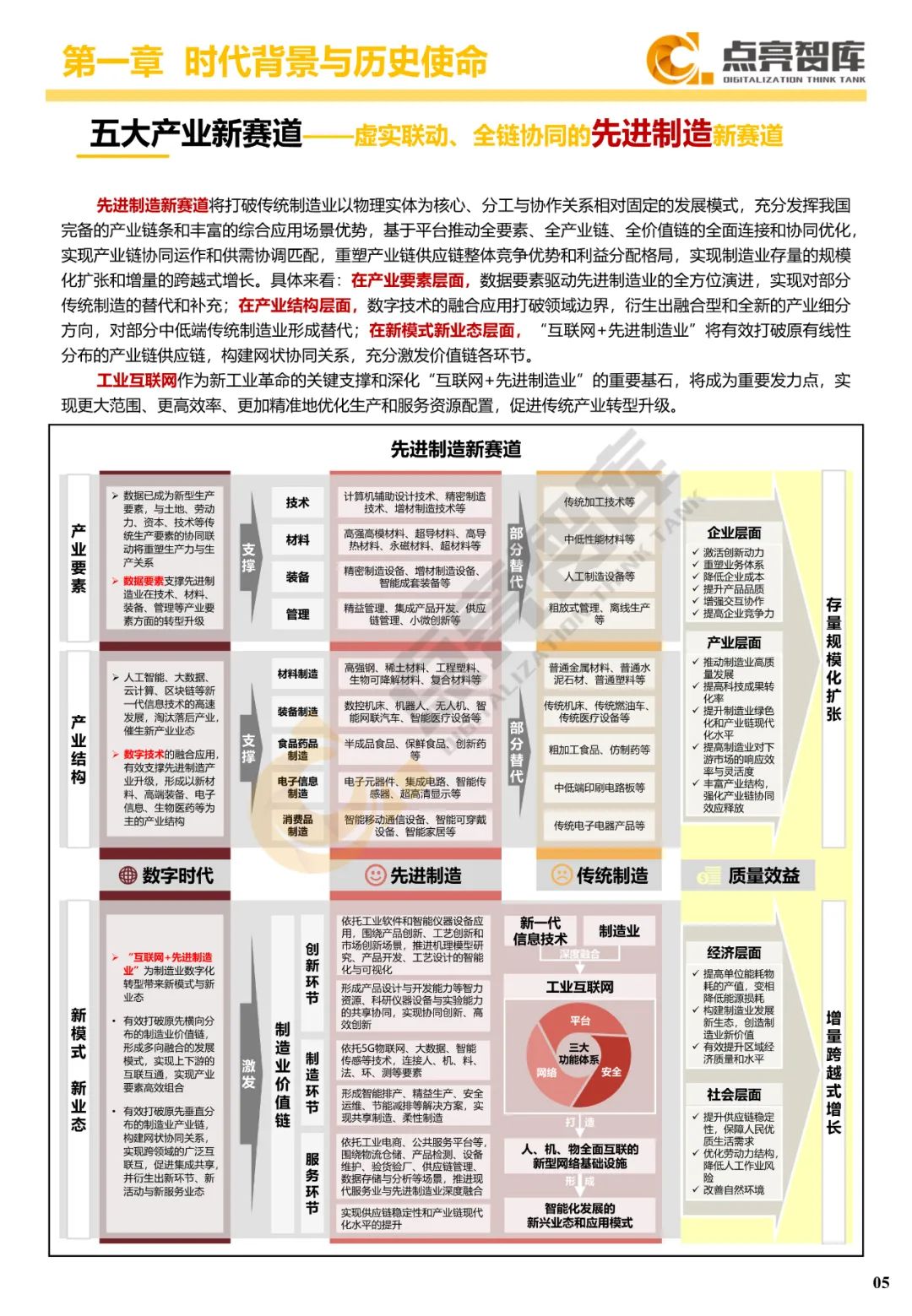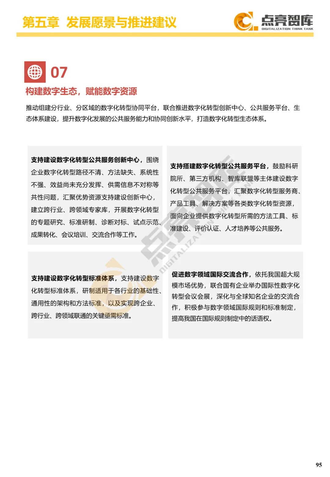 五是从国家战略、创新生态、产业经济、企业发展等4个层面提出12条国有企业数字化转型愿景,并为政府提出强化科技创新、夯实产业基础、培育一流企业、推进链式协同、优化产业体系、加速人才培养、构建数字生态7个方面建议,以推动国有企业由工业时代引领者转变为数字时代领航者,为构建新发展格局、全面建设社会主义现代化国家作出新的更大贡献。
