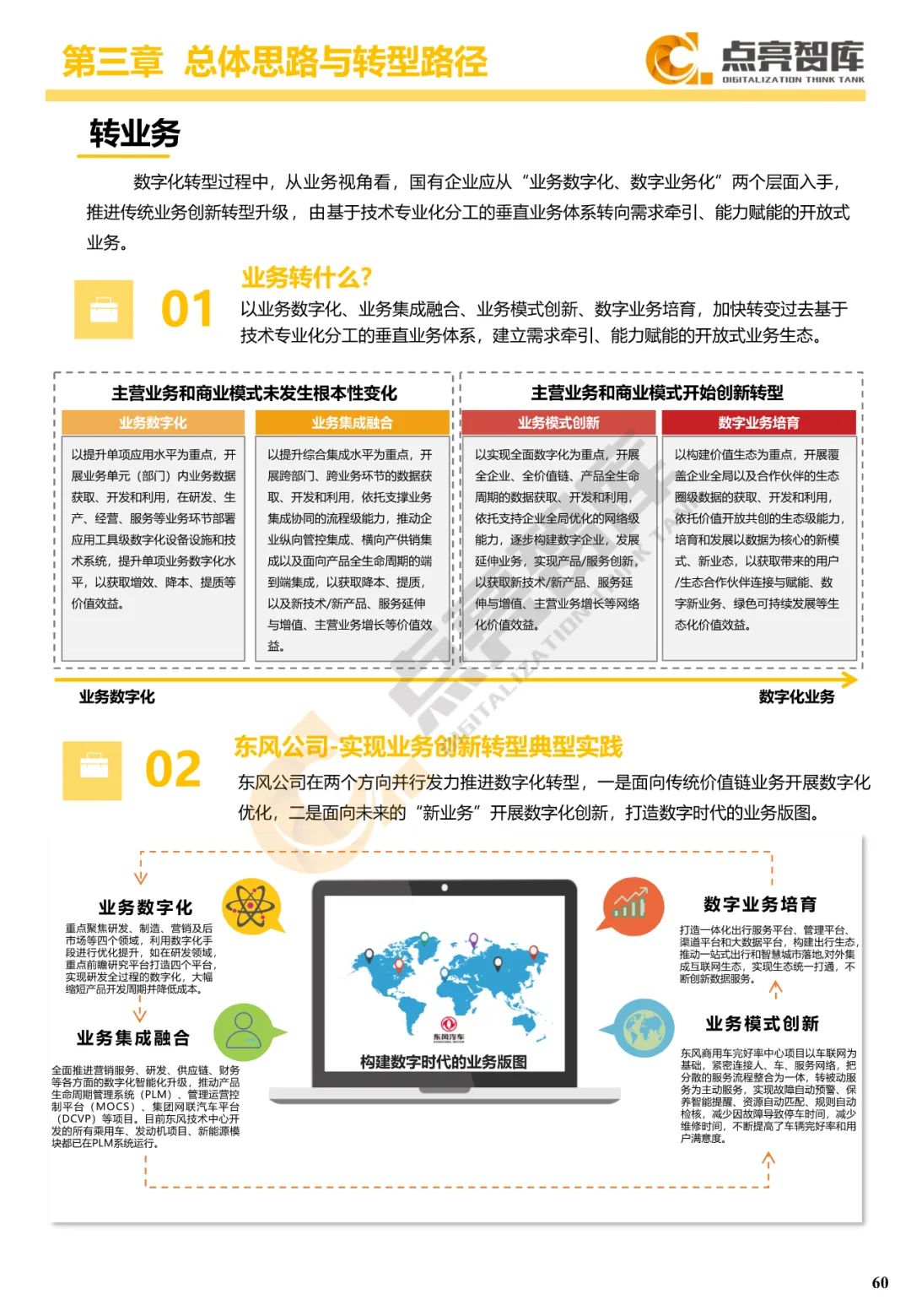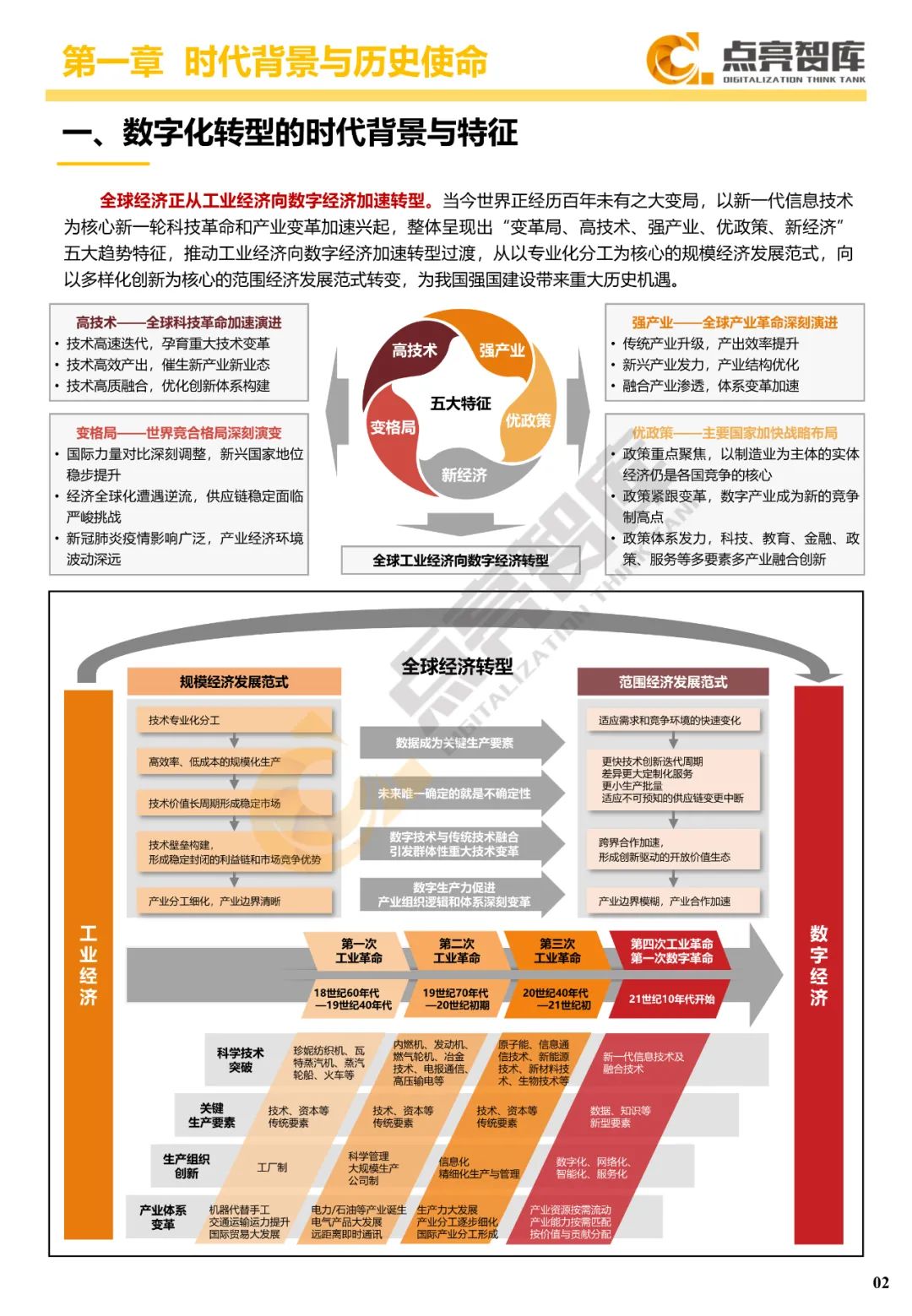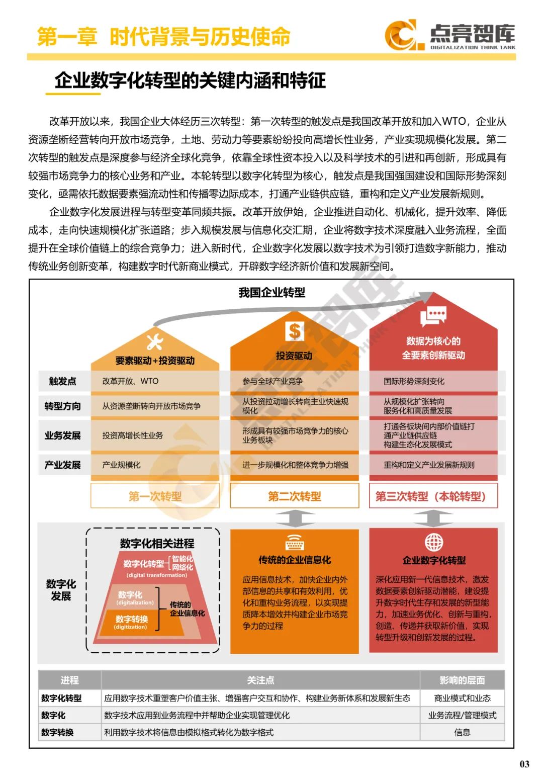 一是深入剖析数字经济时代产业转型变革规律,梳理企业转型与数字化发展历史脉络,给出数字化转型概念定义,提出国有企业数字化转型需强化布局先进制造、智慧能源、数字产业、现代服务、智慧城市五大产业新赛道,发挥使命担当,为我国强国建设贡献力量。