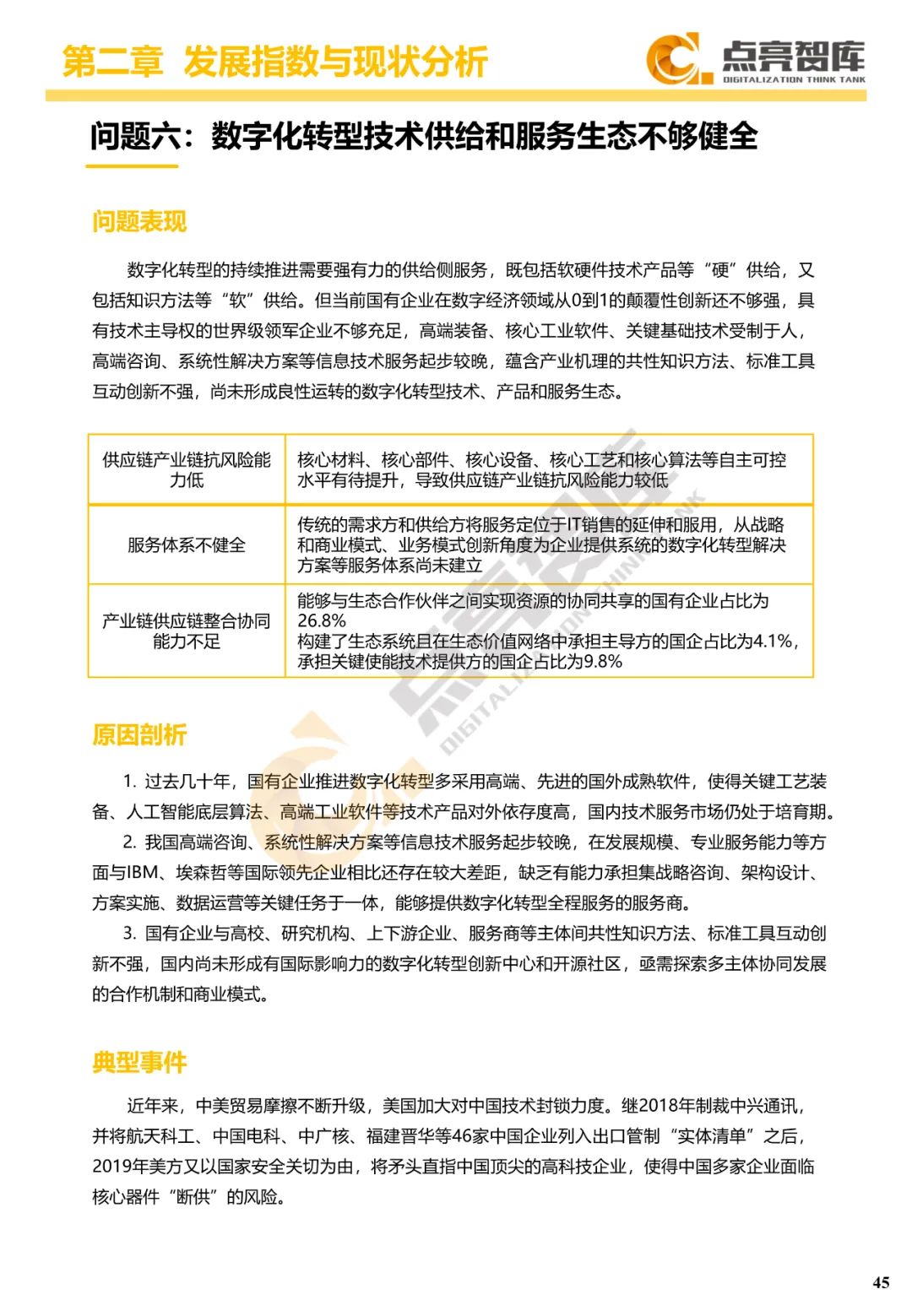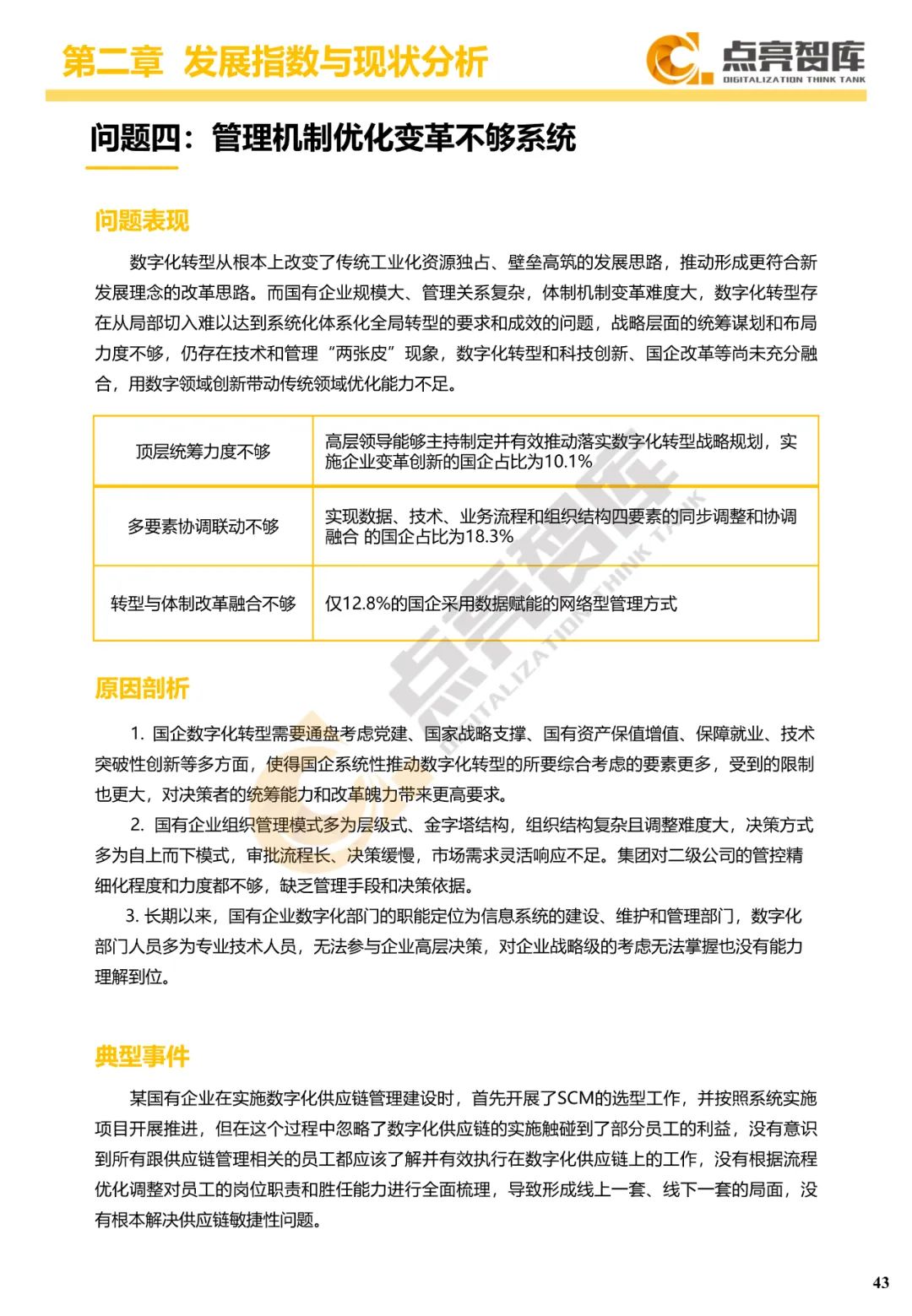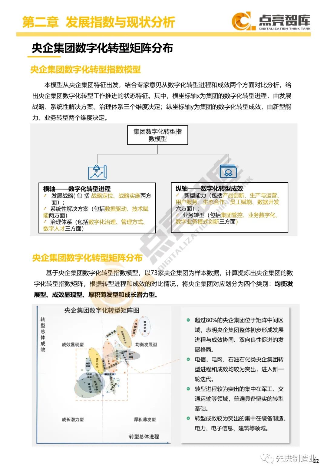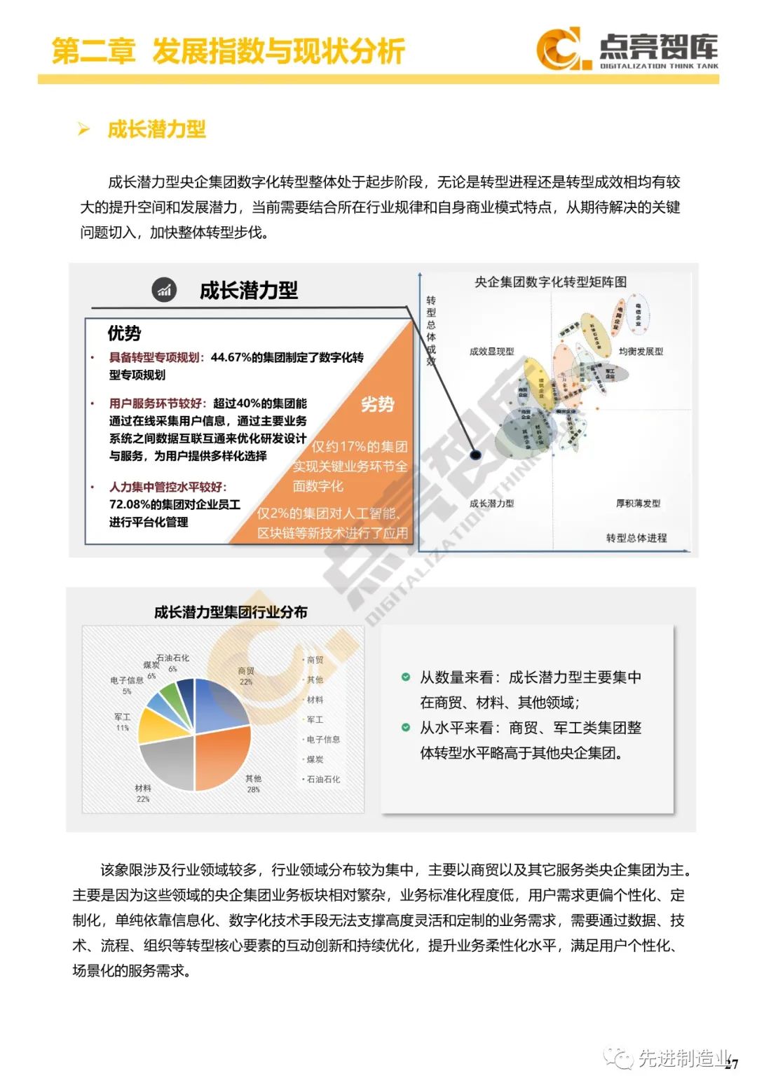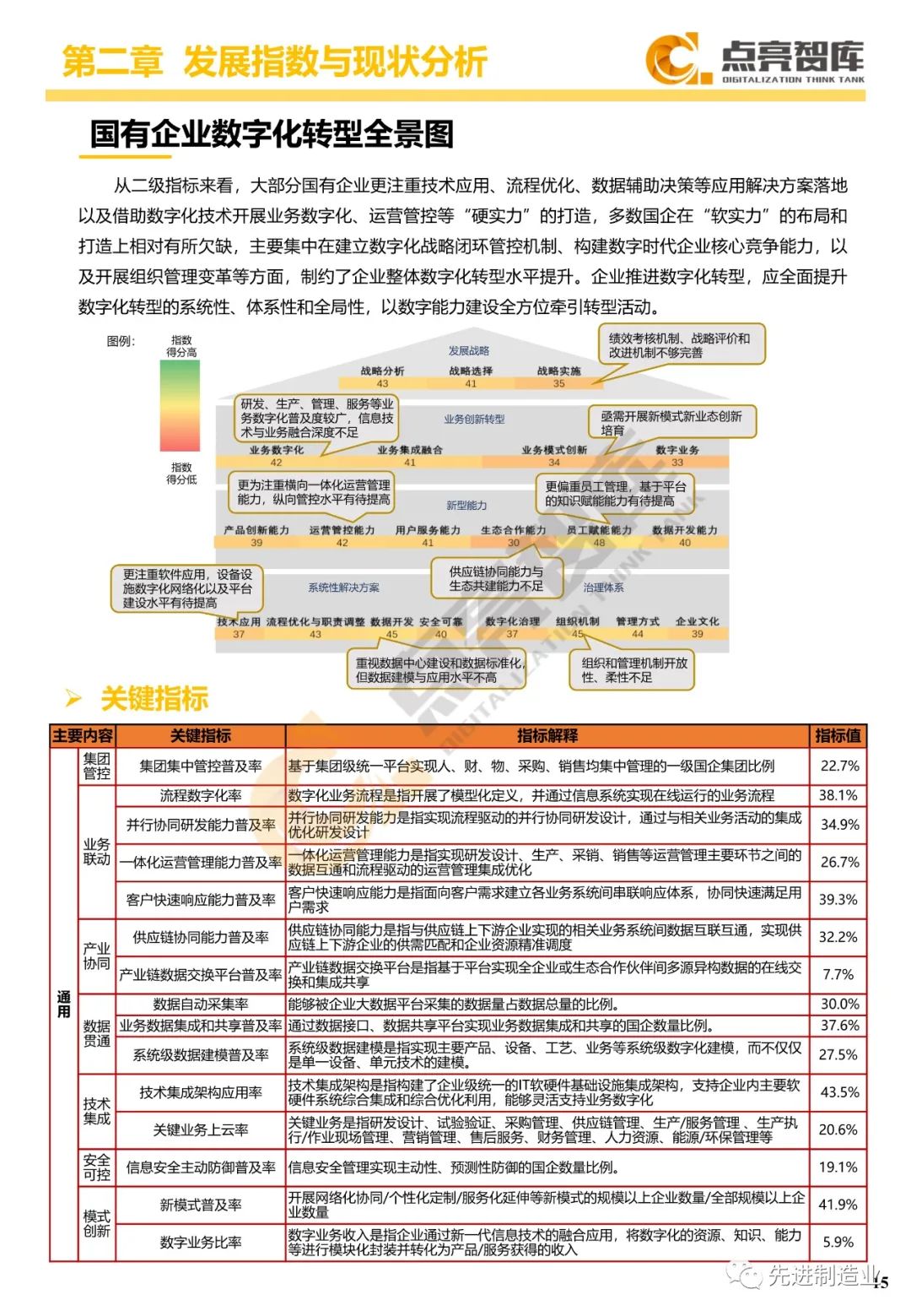 二是构建企业和集团两级数字化转型评价体系,基于超过8000家国有企业现状数据提出1套国企数字化转型指数、15项关键指标、22项行业指标、10大数字化转型趋势、4类央企集团矩阵分布、11大重点行业数字化转型指数、6大存在的关键问题和原因分析。