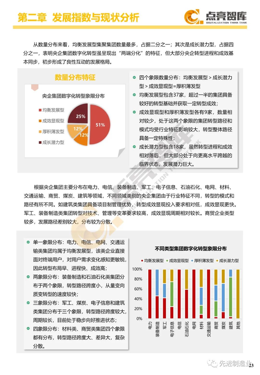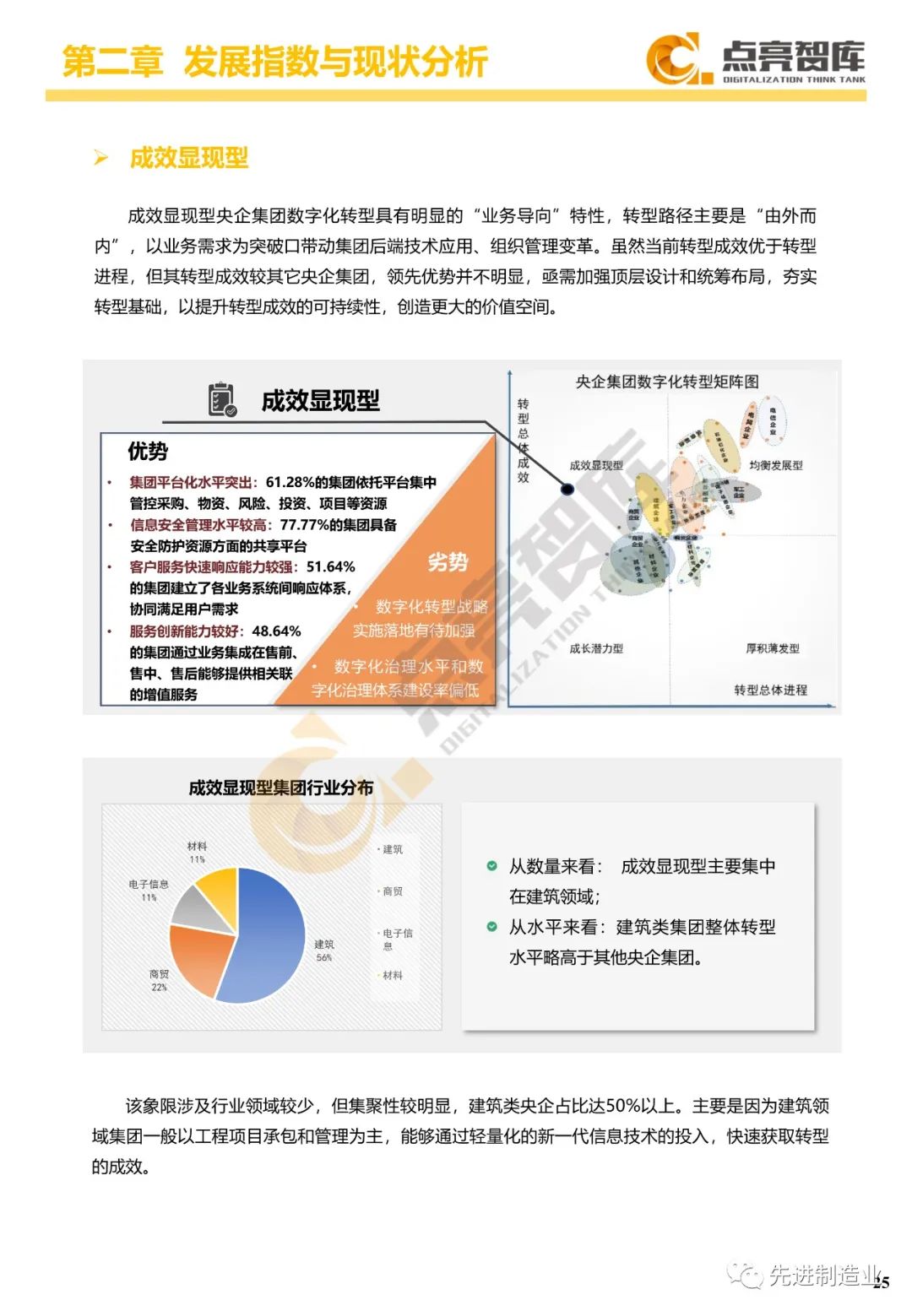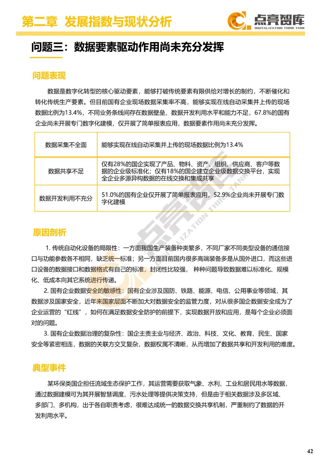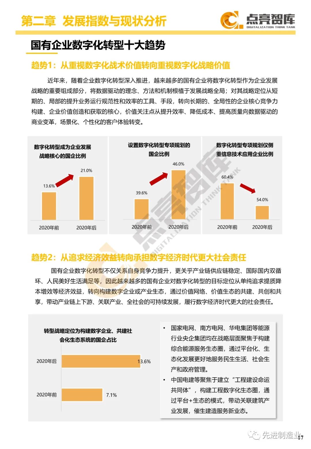 二是构建企业和集团两级数字化转型评价体系,基于超过8000家国有企业现状数据提出1套国企数字化转型指数、15项关键指标、22项行业指标、10大数字化转型趋势、4类央企集团矩阵分布、11大重点行业数字化转型指数、6大存在的关键问题和原因分析。