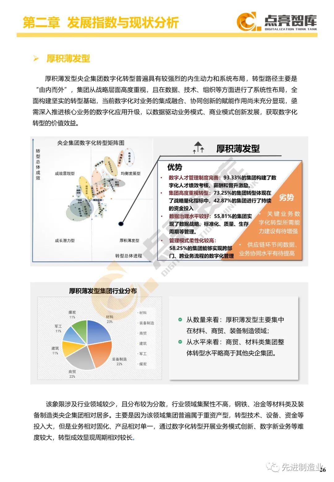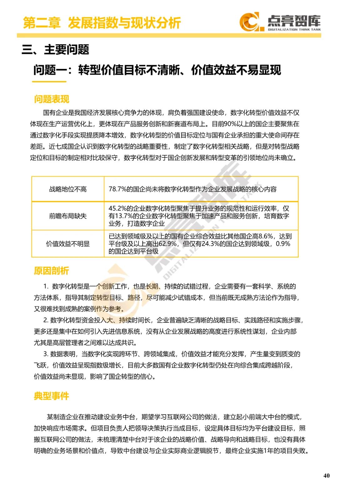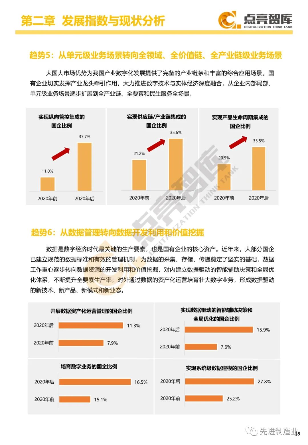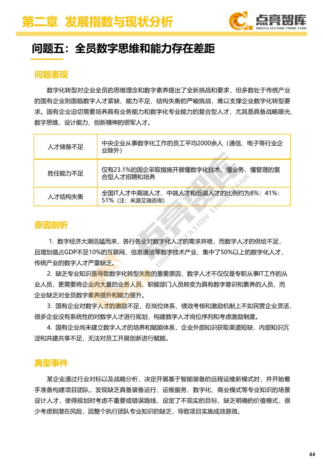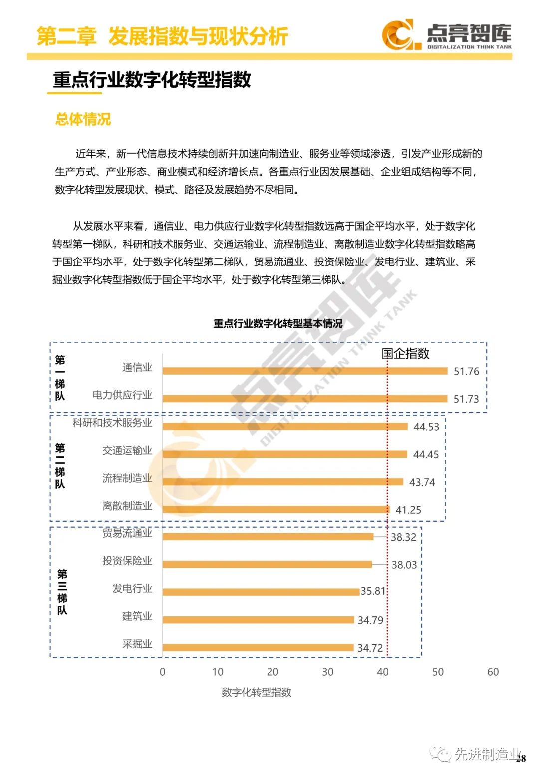 二是构建企业和集团两级数字化转型评价体系,基于超过8000家国有企业现状数据提出1套国企数字化转型指数、15项关键指标、22项行业指标、10大数字化转型趋势、4类央企集团矩阵分布、11大重点行业数字化转型指数、6大存在的关键问题和原因分析。