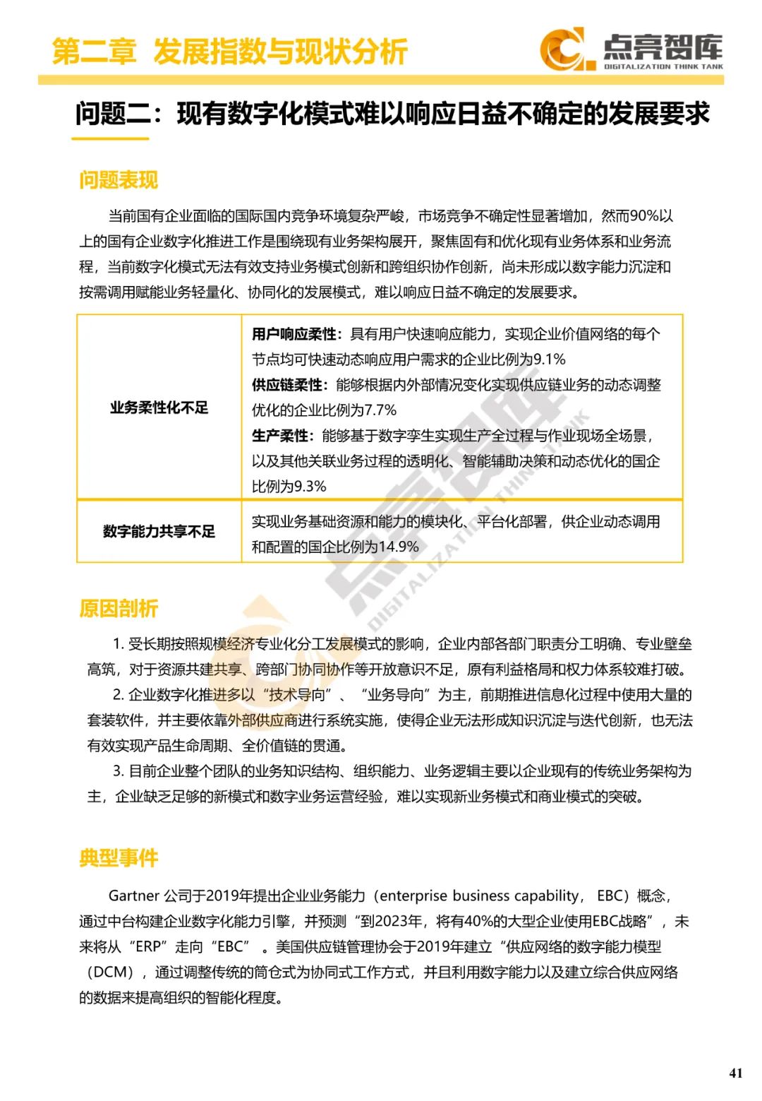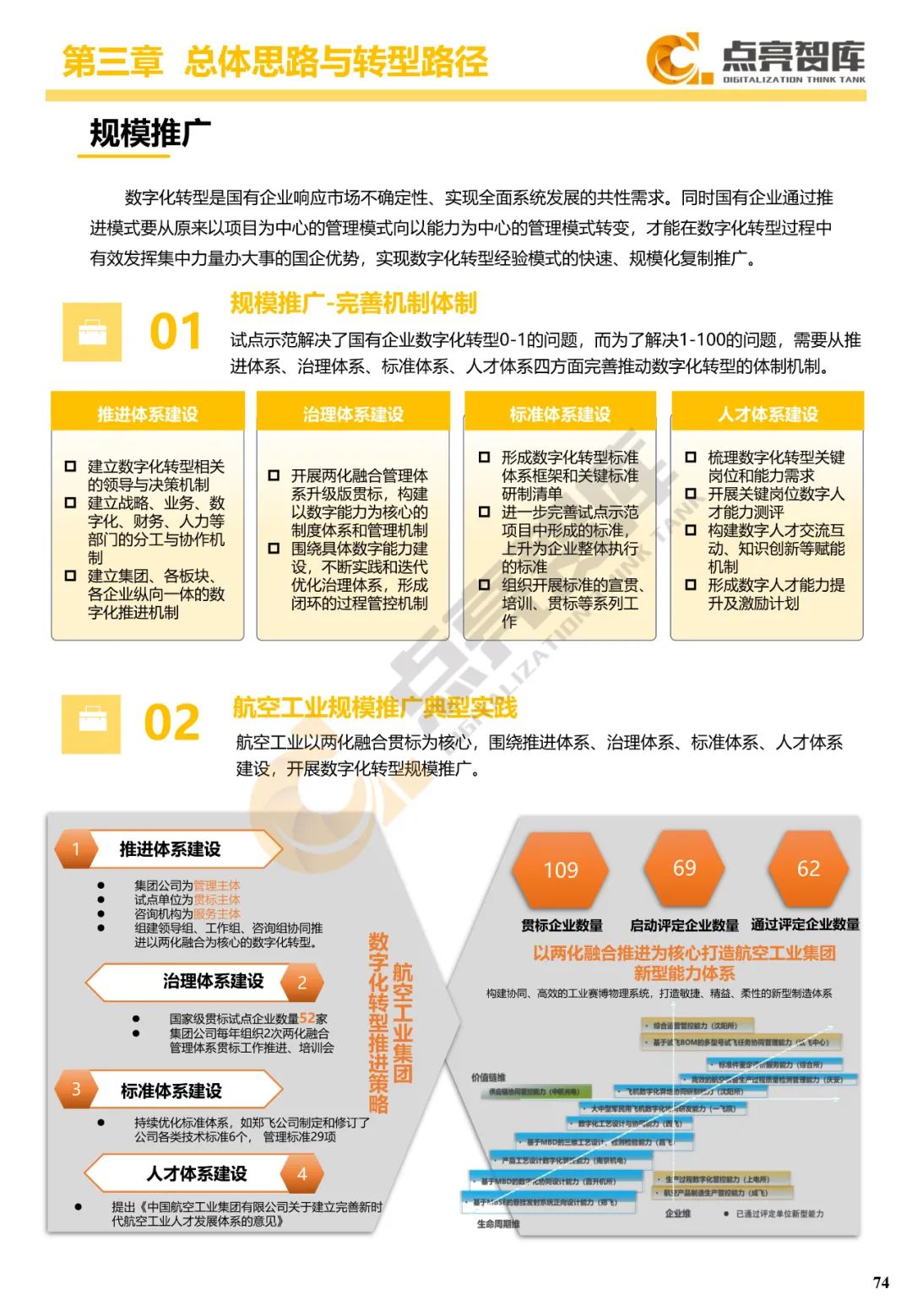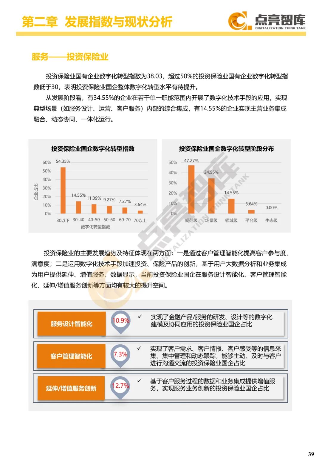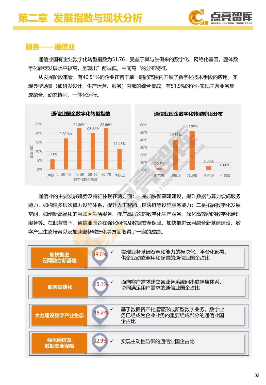 二是构建企业和集团两级数字化转型评价体系,基于超过8000家国有企业现状数据提出1套国企数字化转型指数、15项关键指标、22项行业指标、10大数字化转型趋势、4类央企集团矩阵分布、11大重点行业数字化转型指数、6大存在的关键问题和原因分析。
