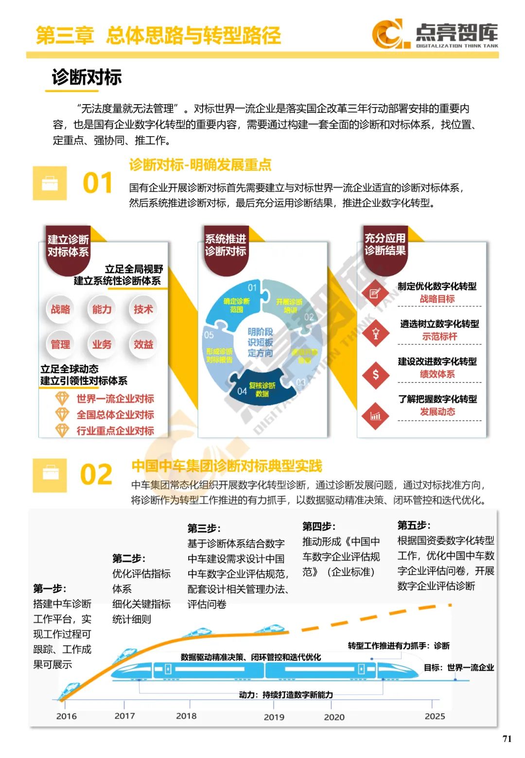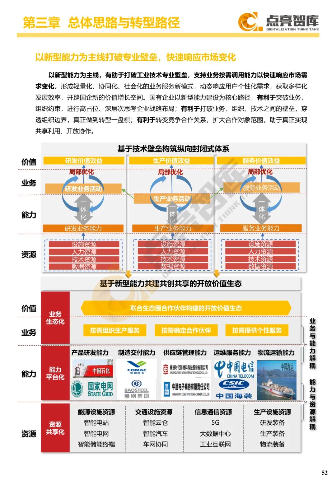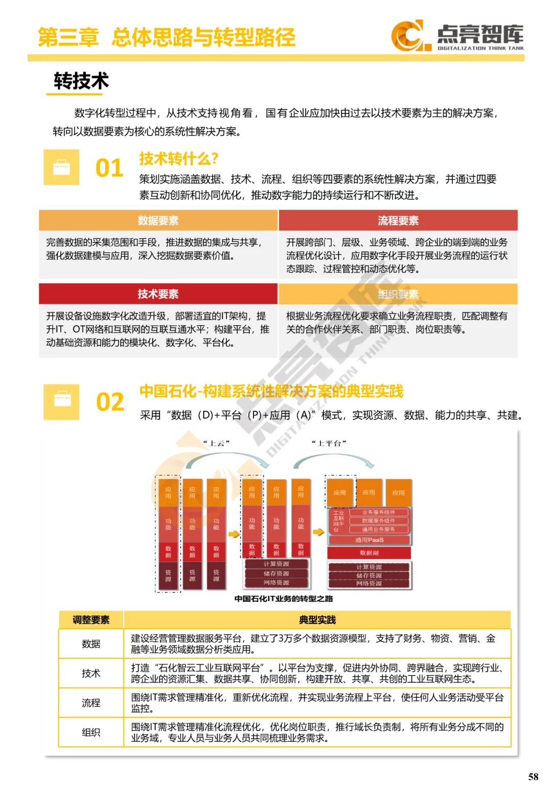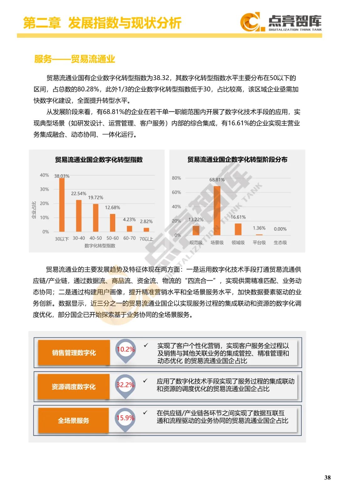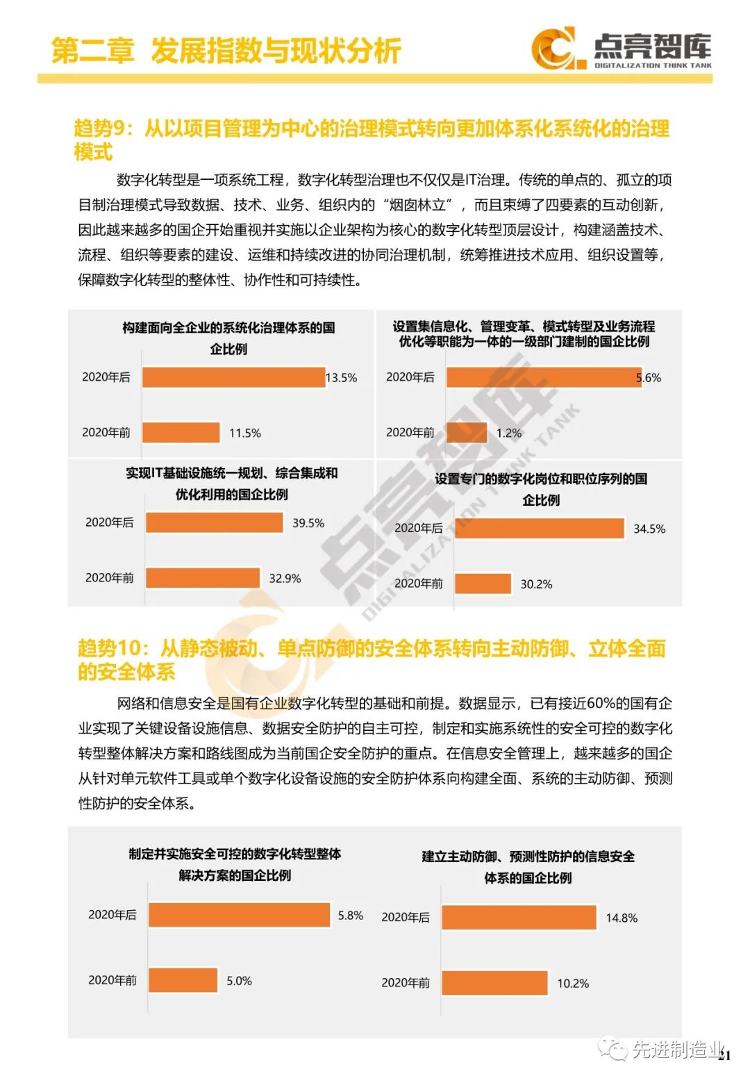 二是构建企业和集团两级数字化转型评价体系,基于超过8000家国有企业现状数据提出1套国企数字化转型指数、15项关键指标、22项行业指标、10大数字化转型趋势、4类央企集团矩阵分布、11大重点行业数字化转型指数、6大存在的关键问题和原因分析。