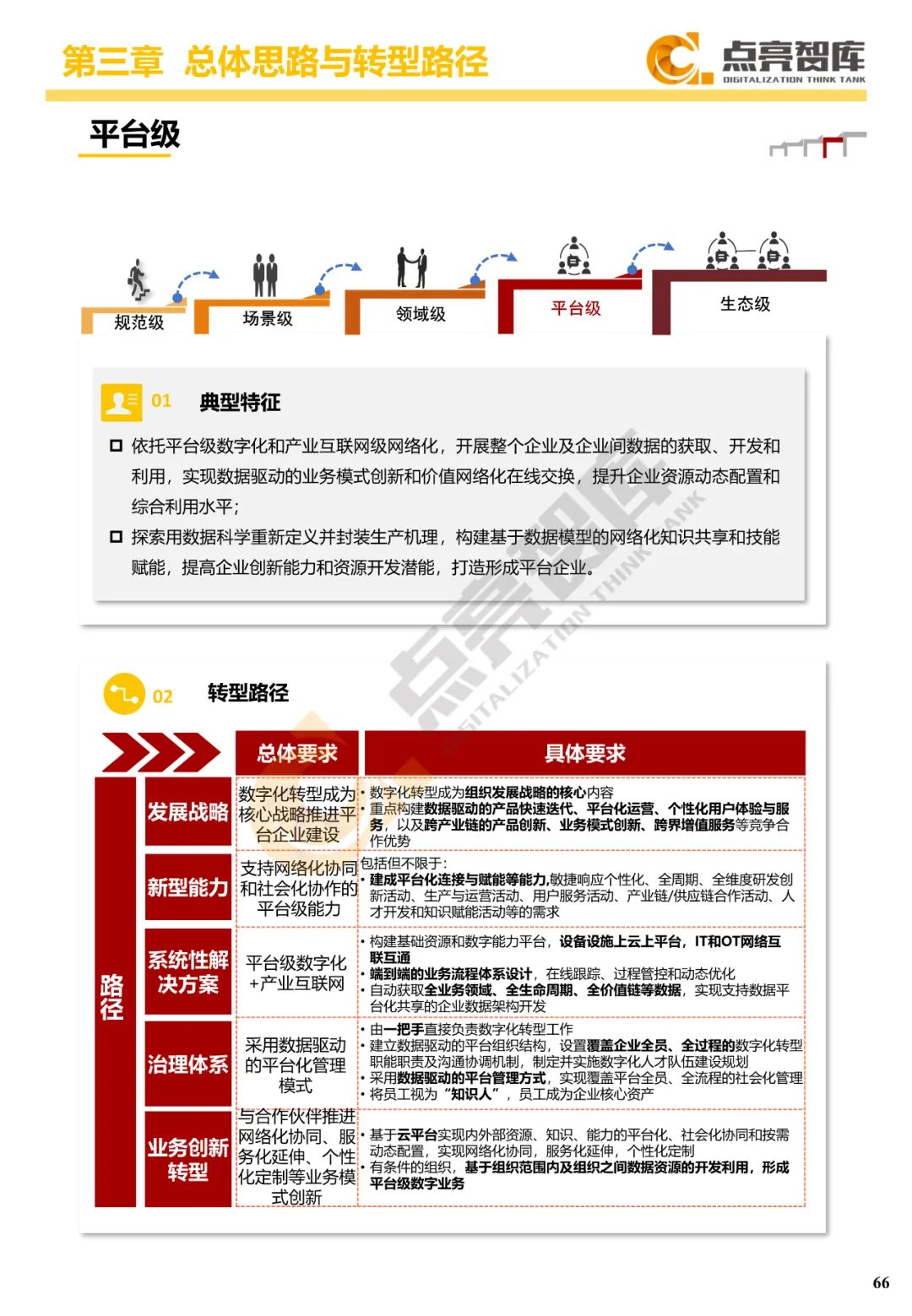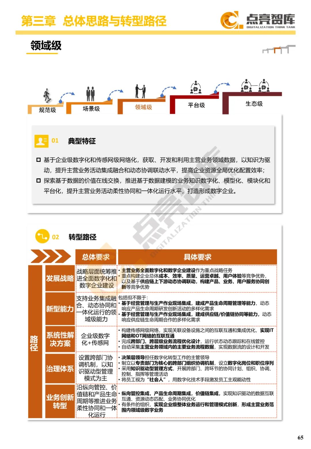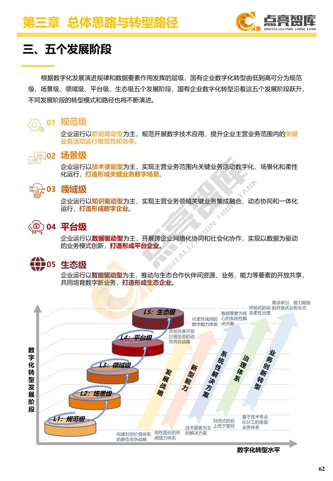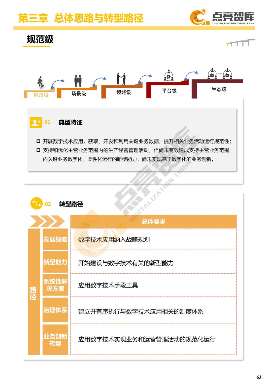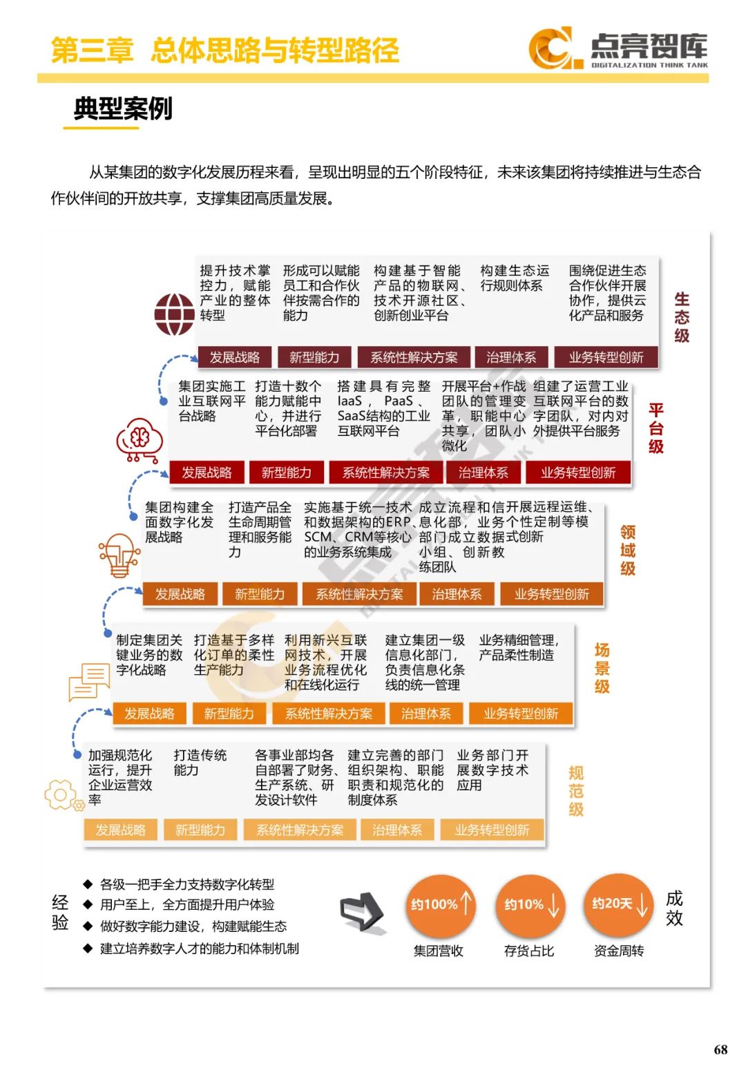 三是提出国有企业数字化转型“3556”方法路径体系,把握价值导向、能力主线、数据驱动三大系统性变革,构建战略、能力、技术、管理、业务等五项任务体系,沿着规范级、场景级、领域级、平台级、生态级五个发展阶段跃升,构建宣贯动员、诊断对标、总体设计、试点示范、规模推广、价值传播“六位一体”协同工作体系和工作抓手。