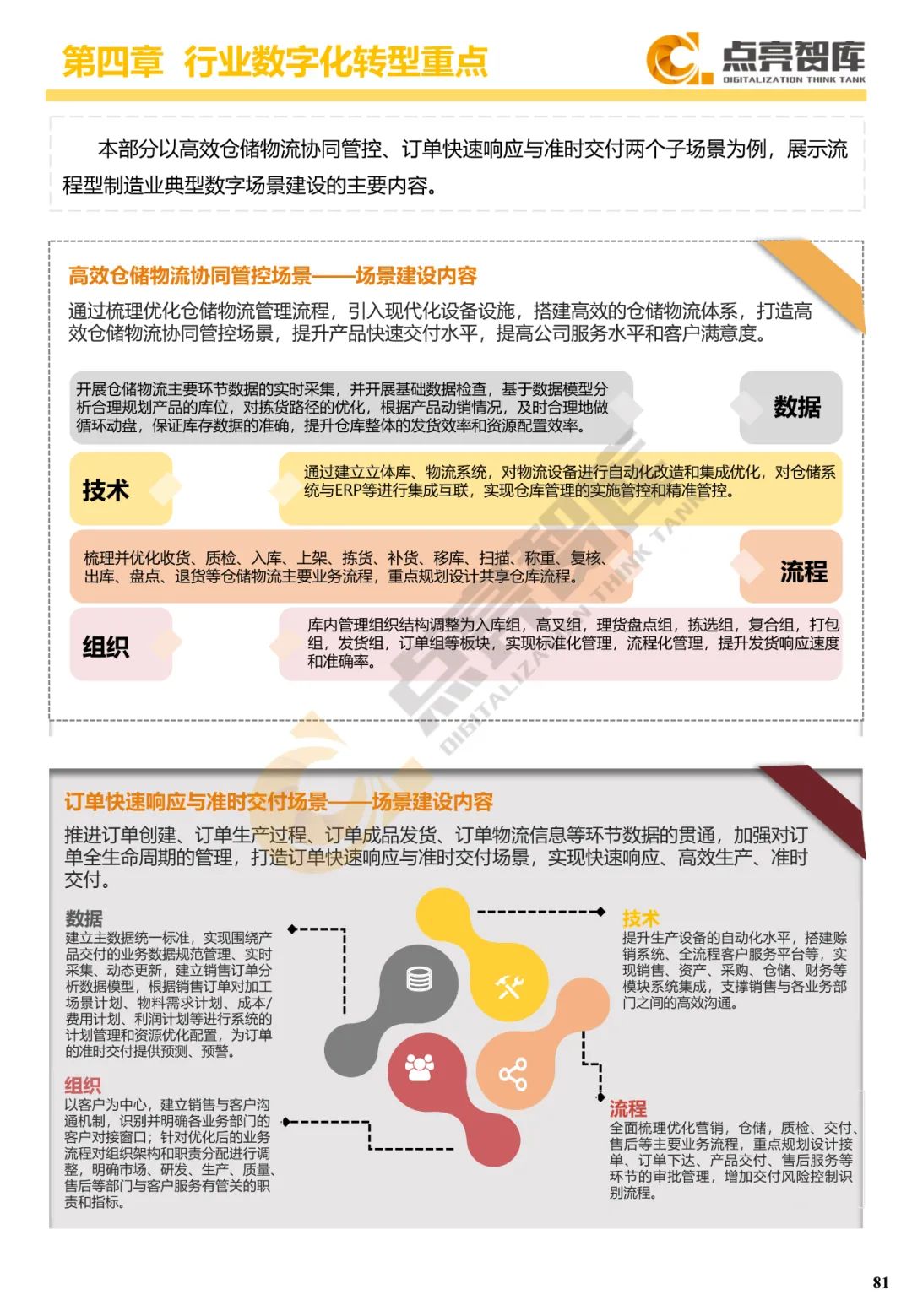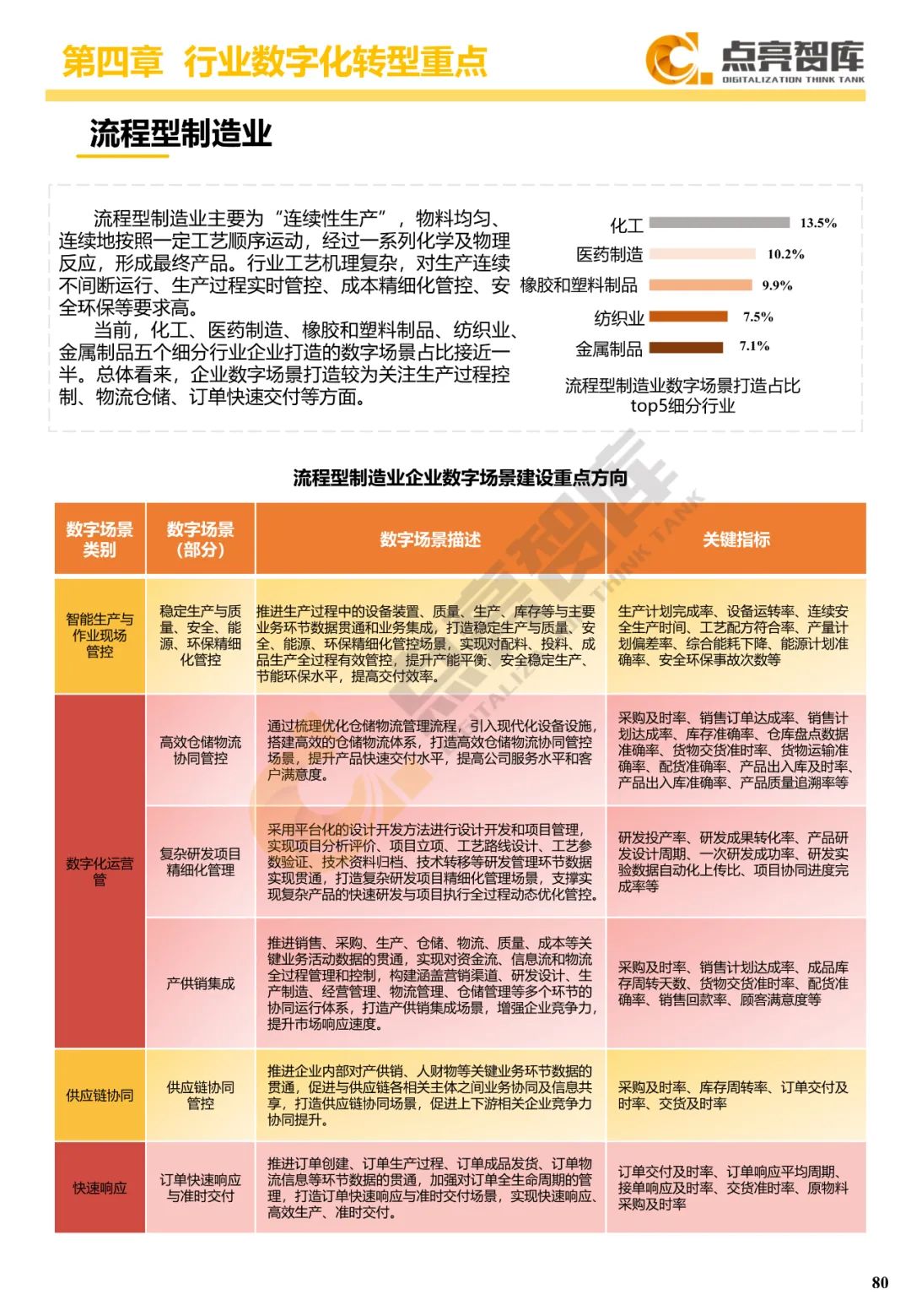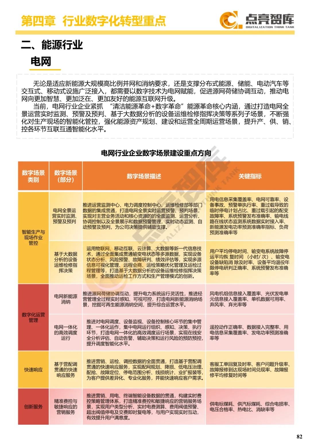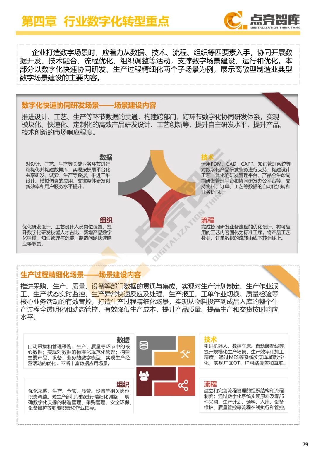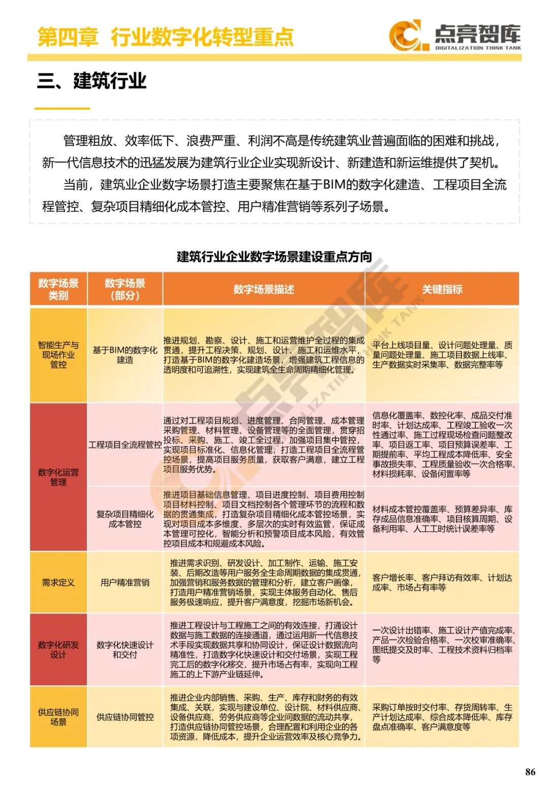 四是围绕离散制造业、流程制造业、能源-发电、能源-电网、建筑业、服务业等六大行业门类提出34个典型数字场景及其内容和关键绩效指标,并从数据、技术、流程、组织4个维度给出10个场景建设案例。