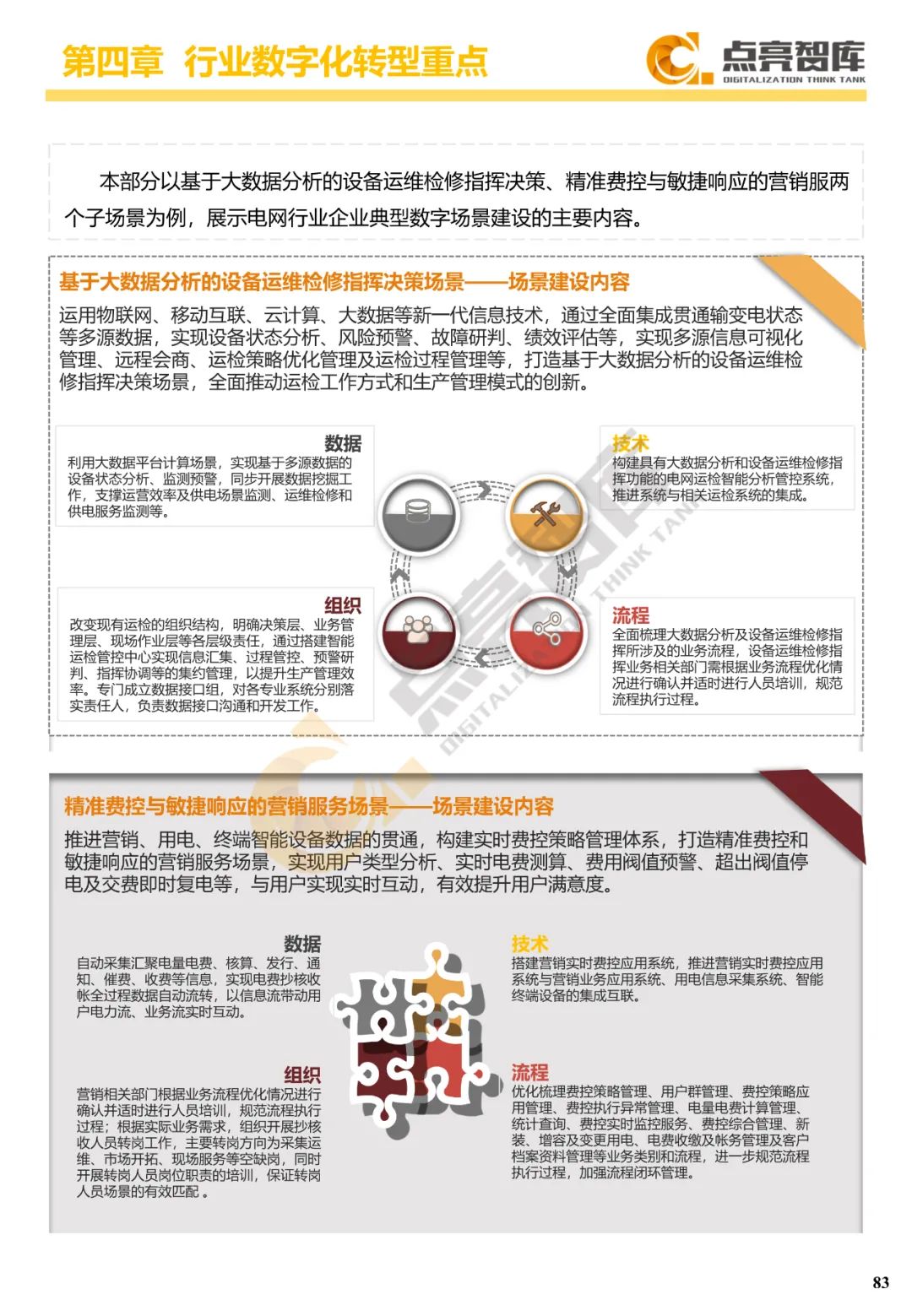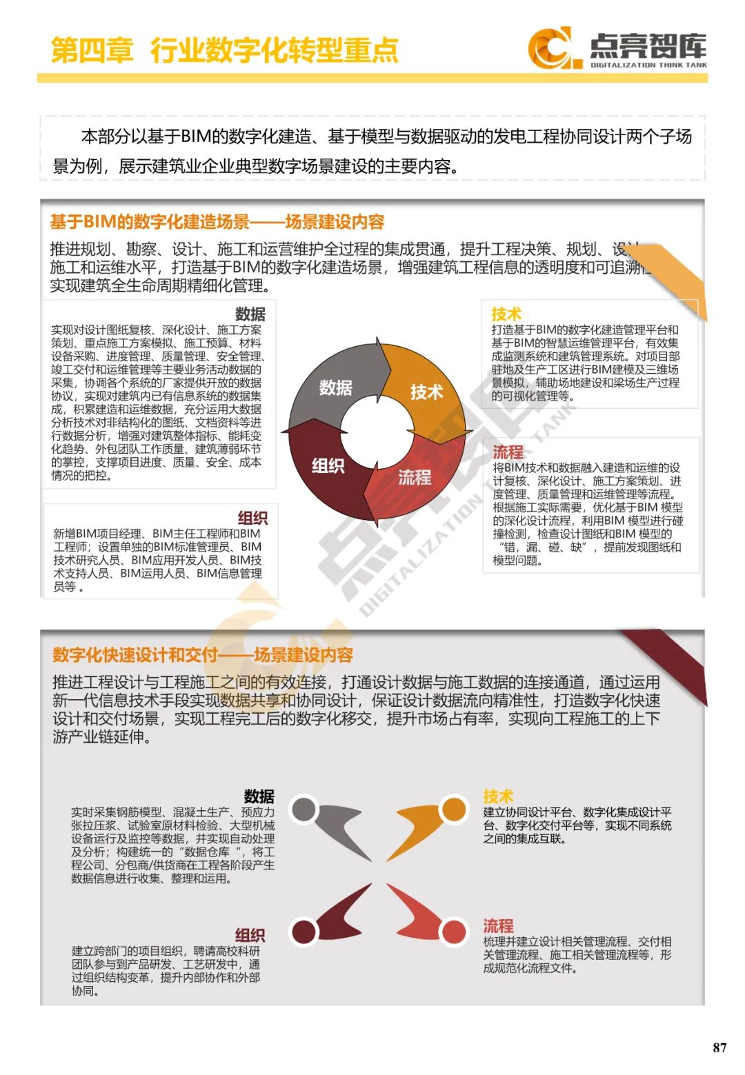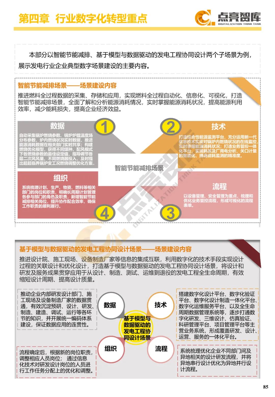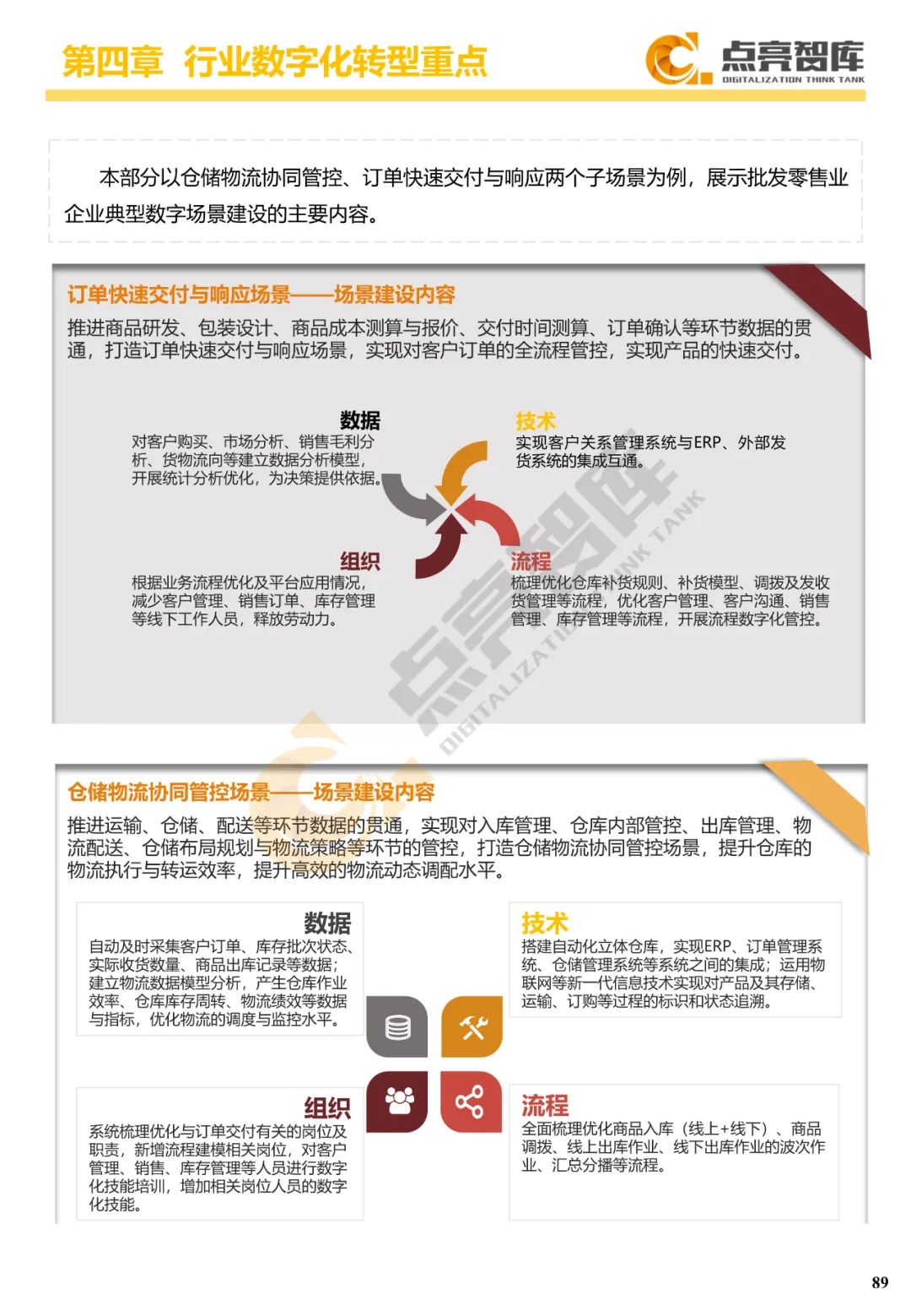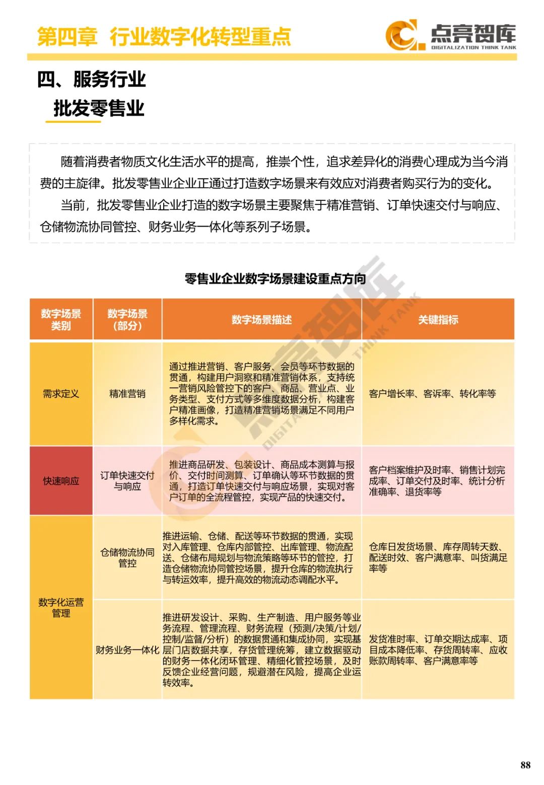 四是围绕离散制造业、流程制造业、能源-发电、能源-电网、建筑业、服务业等六大行业门类提出34个典型数字场景及其内容和关键绩效指标,并从数据、技术、流程、组织4个维度给出10个场景建设案例。