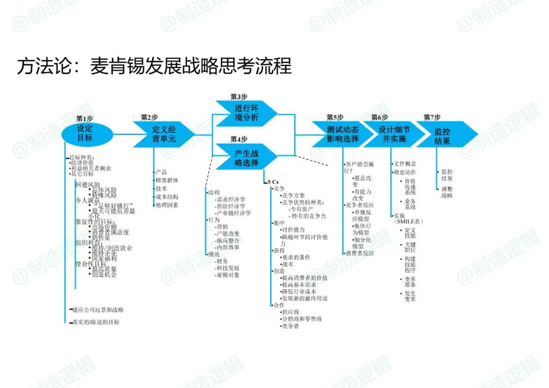在解读企业战略时,可以参考如下麦肯锡提出的发展战略规划七步法。第1步:设定目标第2步:定义经营单元第3步:进行环境分析第4步:产生战略选择第5步:测试动态影响并作出选择第6步:设计细节并实施第7步:监测结果并调整战略