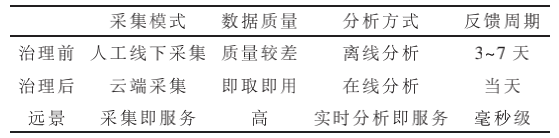 图 8 数据对齐前后建模误差对比图8展示了数据对齐前后预制棒BA比(芯层直径与包层直径之比)的建模预测误差率,曲线越靠下表示预测误差越低。可以看出,经过数据治理后,同样样本量下,由于数据对齐后能够进行测点分段映射,扩充了模型训练数据,使得基于随机森林的回归预测模型建模预测误差率明显降低。3、异常识别与预警传统异常告警机制具有告警模型单一,人工识别工作量大等缺陷,人工标注效率较低,而且误标、漏标率较高。光纤工业的常见异常类型包括脉冲型异常,阶跃型异常以及模式异常,基于大量数据采用时序差分特征和时间窗统计特征构建的时间序列异常识别模型,能够实现复杂环境下的异常告警需求,同时极大提高历史异常识别效率,原本进行数据的收集、整理,再人工对异常进行标注的工作需要花费数天时间,通过数据治理集成异常识别模型后,只需要花费几分钟的时间即可完成历史异常的识别和分析。4、数据分析周期优化在光纤工业中,针对产品品质的数据分析是生产过程中的重要环节,需要不断通过分析确定工艺参数的调整方向,以此改善生产品质,保证生产稳定性。开展数据治理前,数据分析的周期长、工作量大,分析的数据量也比较有限。在实施数据治理之后,采用云端采集和在线分析,代替过去手动采集和离线分析的方式,同时保证了数据的准确性和完整性,大大减少分析人员在繁琐的数据预处理任务中耗费的时间。数据治理前后对比如表1所示。