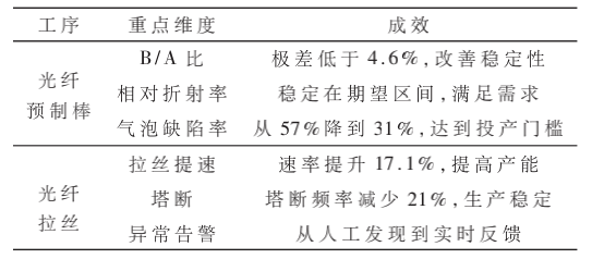 图 9 数字化大屏企业运营大屏展现了企业光棒、光纤、光缆的原料、生产、检验、仓储、销售等关键环节的信息。生产状况大屏通过综合产量、良品率、稳定性、资源消耗等多方面因素建立的分析模型为产线评分,直观展现产线整体情况。产品画像大屏基于历史生产数据、质量测试数据构建产品画像,以质量数据为导向回溯生产数据,量化展示产品质量差异的原因。6、产品质量与效率提升目前,企业在光纤预制棒、光纤拉丝中有诸多方面的提升,如表2所示。其中在光纤预制棒阶段,生产过程中内部形成杂质和气泡,会严重影响后续光纤拉丝过程。经数据治理后,数据质量提高,通过数据分析与建模,不断优化生产工艺,有效降低预制棒的气泡缺陷率,改善光纤预制棒的均匀性和重复性,良品率大幅度提升,达到投产门槛;在光纤拉丝阶段,在拉丝提速、塔断及告警反馈等方面的业务痛点方面有明显的改善,拉丝良品率有效提升。
