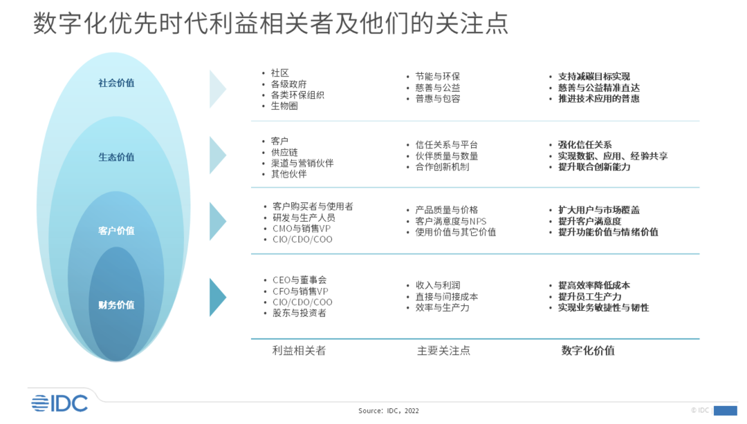 数字化优先不是单纯的技术或商业模式,而是企业的一种远景,一种对数字技术价值的认可、期待和行动。数字化优先时代要求规模化创新可持续化、情景化、实时化。数字化优先也在重新定义数字化的价值:财务价值、客户价值、生态价值、社会价值。