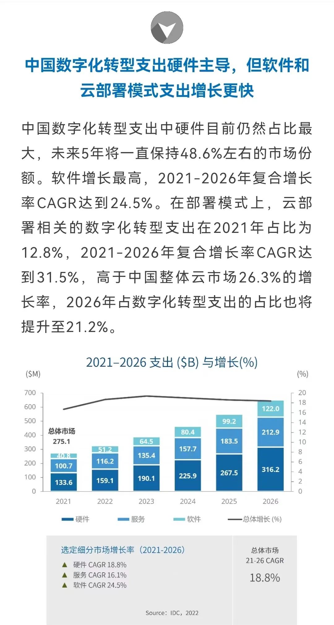 2022年,无论全球还是中国,超过50%的经济(中国约超60万亿元人民币)是基于数字化或受数字化影响的,中国2022-2026年数字化转型总支出将达到2.38万亿美元。