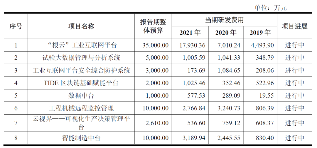 各类人员中,最值得关注的,当然是研发成本,招股书中也列出了主要的研发内容,可以看到,根云主平台就投入了3.5亿。
