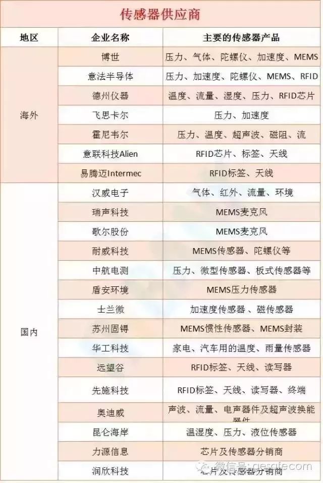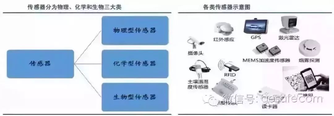2、传感器供应商:塑造物联网的“五官”传感器是物联网的“五官”,本质是一种检测装置,是用于采集各类信息并转换为特定信号的器件,可以采集身份标识、运动状态、地理位置、姿态、压力、温度、湿度、光线、声音、气味等信息。广义的传感器包括传统意义上的敏感元器件、RFID、条形、条形码、二维码、雷达、摄像头、读卡器、红外感应元件等。工程常用的传感器可分为物理类传感器、化学类传感器,生物类传感器三大类。而根据传感器的基本知功能可细分为热敏元件、光敏元件、气敏元件、力敏元件、磁敏元件、湿敏元件、声敏元件、放射线敏感元件、色敏元件和味敏元件十种。