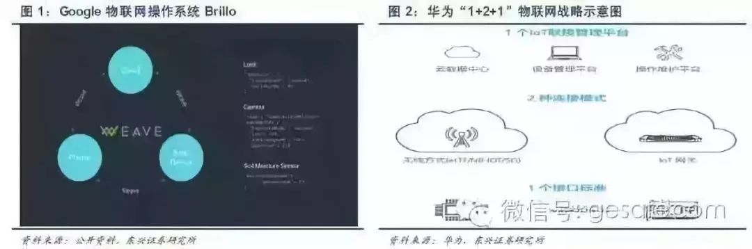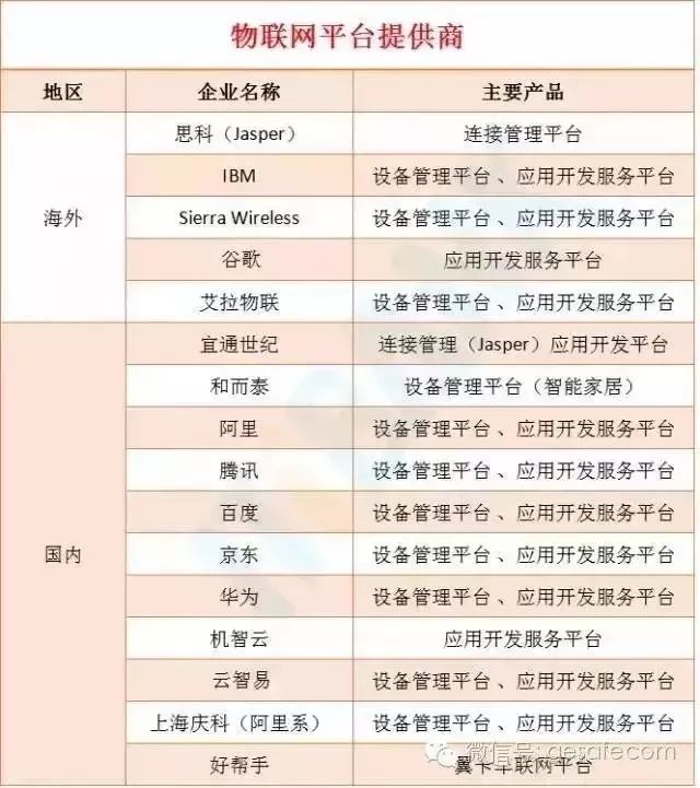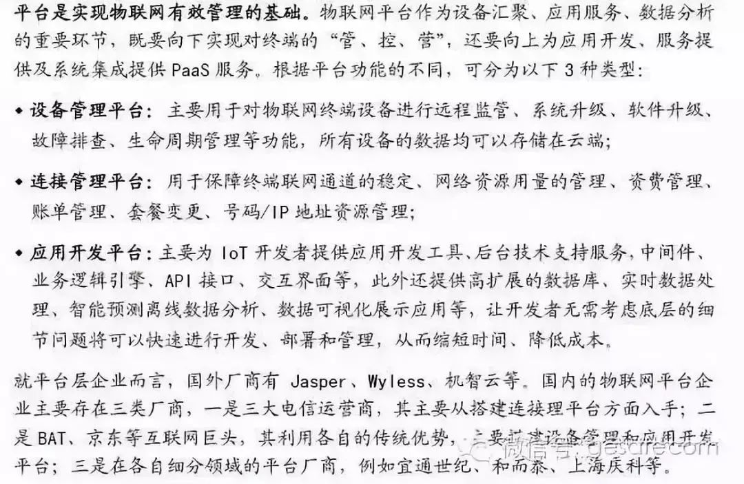 (物联网产业链全景图)物联网发展的当务之急是先联网,再谈增值应用。一、巨头入局,行胜于言英特尔:2014年发布爱迪生(Edison)可穿戴及物联网设备的微型系统级芯片,2015年推出居里(Curie)芯片,集成了低功耗蓝牙通信能和运动传感器;谷歌:提出Project IoT物联网计划,2015年发布Brillo物联网底层操作系统,该系统源于Android,支持ARM、X86、MIPS架构的智能硬件;思科:2016年斥资14亿美元收购Jasper全部股权,完善物联网生态体系;软银:拟310亿美元收购芯片专利授权巨头ARM,卡位物联网芯片端;华为:推动NB-IoT标准制定;先后发布物联网操作系统LiteOS、NB-IoT端到解决方案,提出“1+2+1”战略,努力构建OceanConnect生态圈;百度:2015年发布百度IoT,与ARM、MTK、TI、科通芯城等联合推动物联网发展;阿里巴巴:2016年发布物联网整体战略,集合旗下阿里云、阿里智能、YunOS,联合打造面向物联网时代的服务平台;2014年还联合庆科发布物联网操作系统MICO;腾讯:2014年推出“QQ物联智能硬件开放平台”,将QQ账号体系及关链、QQ消息通道等核心能力提供给可穿戴设备、智能家居、智能车载、传统硬件等领域合作伙伴,实现用户与设备及设备与设备之间的互联互通互动;中国移动:成立物联网公司、车联网公司,搭建物联网专网、提供专号、建设物联网设备接入管理平台和物联网应用开发平台,大力推动物联网业务发展。