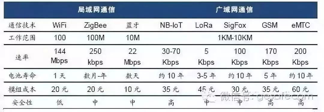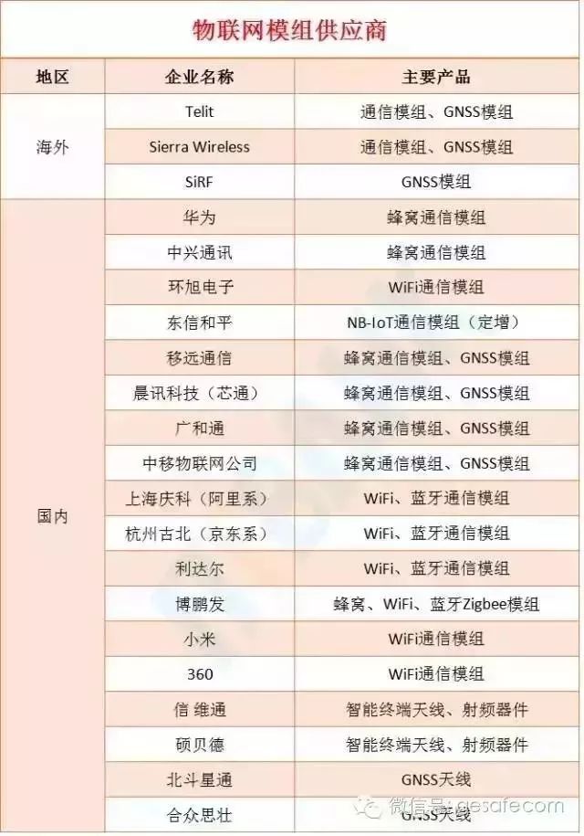 3、无线模组厂商:实现联网和定位的“关键”无线模组是物联网接入网络和定位的关键设备。无线模组可以分为通信模组和定位模组两大类。常见的局域网技术有WiFi、蓝牙、ZigBee等,常见的广域网技术主要有工作于授权频段的2/3/4G、NB-IoT和非授权频段的LoRa、SigFox、等技术,不同的通信对应、不同的通信模组。NB-IoT、LoRa、SigFox属于低功耗广域网(LPWA)技术,具有覆盖广、成本低功耗小等特点,是专门针对物联网的应用场景开发的。
