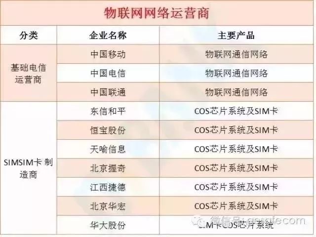 4、网络运营商:掌控物联网的“通道”网络是物联的通道,也是目前物联网产业链中最成熟的环节。广义上来讲,物联网的网络是指各种通信网与互联网形成的融合网络,包括蜂窝网、局域自组网、专网等,因此涉及到通信设备、通信网络(接入网、核心网业务)、SIM制造等。考虑到物联网很大程度上可以复用现有的电信运营商络(有线宽带网、2/3/4G移动网络等),同时国内基础电信运营商具有垄断特征,是目前国内物联网发展的最重要推动者。因此我们在这个环节将聚焦三大电信运营商和与之紧密相关、且会受益蜂窝物联网终端增长的SIM卡制造商身上,如东信和平、恒宝股份、天喻信息等。