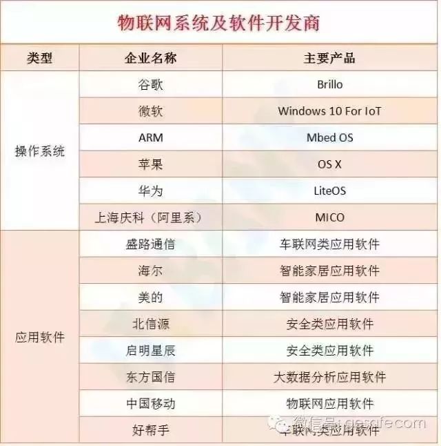 目前,发布物联网操作系统的主要是一些IT巨头,如谷歌、微软、苹果、华为、阿里等。由于物联网目前仍处阶段,应用软件开发还处于起步阶段,主要集中在车联网、智能家居、终端安全等通用性较强的领域,如盛路通信、海尔、启明星辰等。