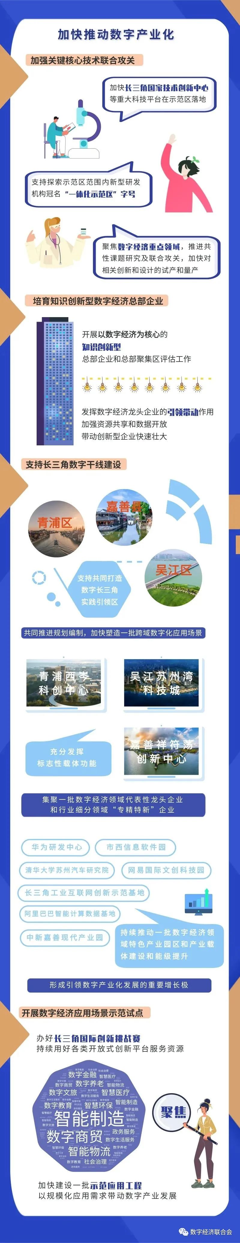 在加快推动数字产业化方面,《若干举措》提出加强关键核心技术联合攻关,培育知识创新型数字经济总部企业,支持长三角数字干线建设,开展数字经济应用场景示范试点共4条举措。