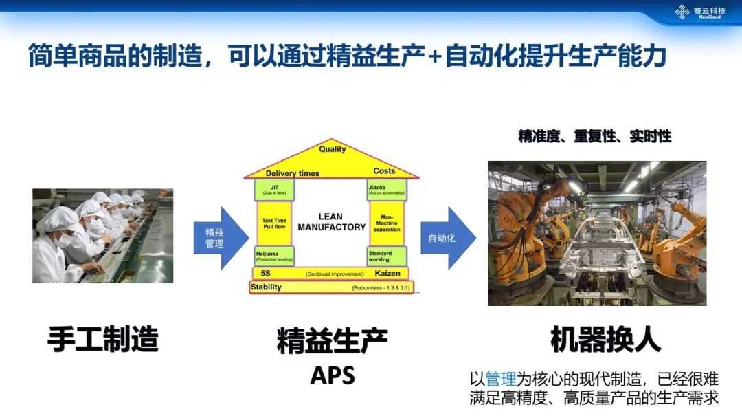 早期的手工制造相对落后,后来有了5S、kaizen、JIT等精益的管理,人员素质和管理效率得到了提升。在这个基础上工业又走向自动化,通过“机器换人”的方式去避免很多重复性的劳动,也带来时效性、精准度的提高。