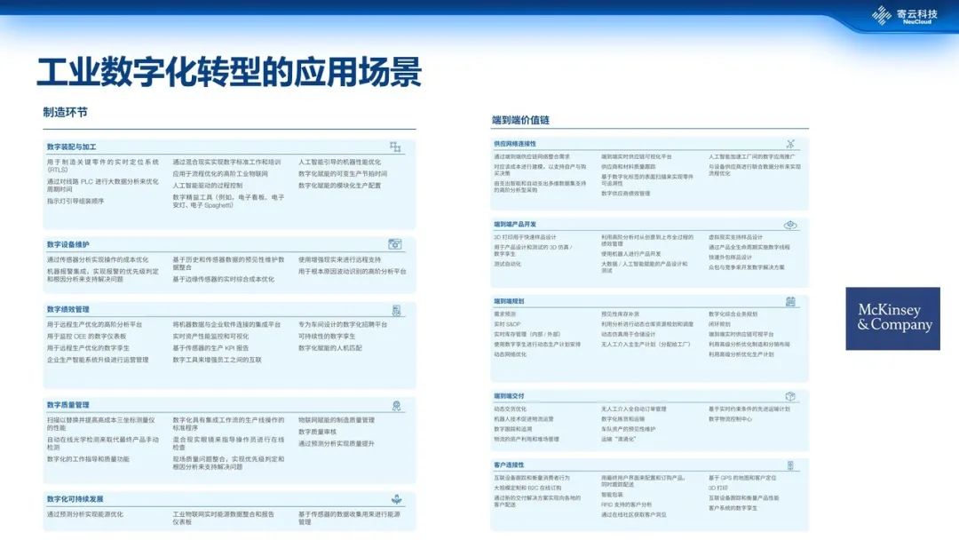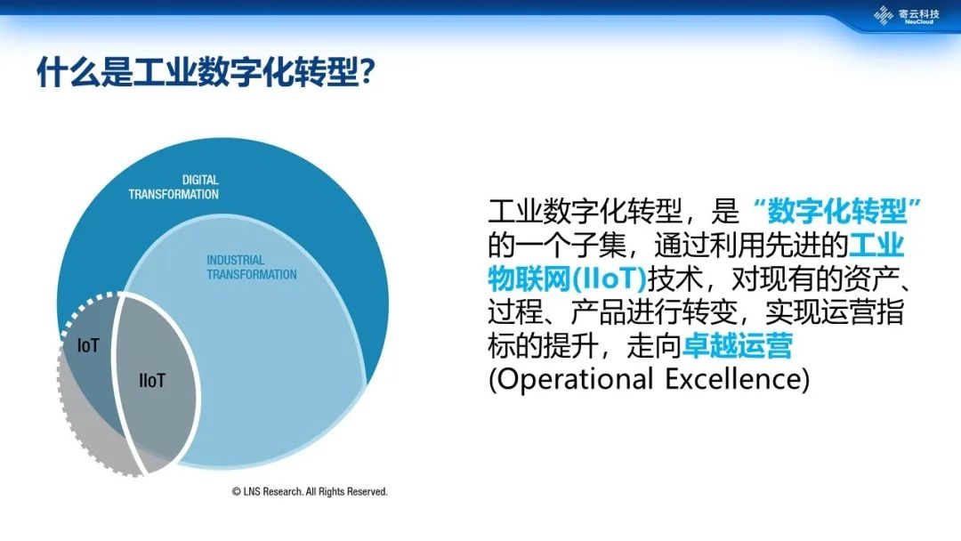 工业数字化转型是数字化转型的一个子集,它利用工业物联网等先进技术对现有的资产、过程、产品进行转变,实现运营指标提升,走向卓越运营。卓越运营(Operational Excellence)实际上是一系列关键指标的优化,其应用场景涵盖装配、加工、预测性维护、绩效管理、质量管理以及可持续发展这一系列的制造环节,甚至延展到产业链的上下游。