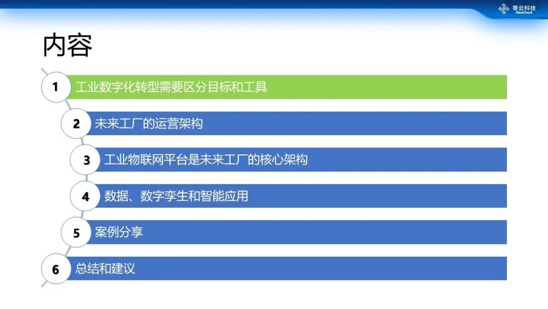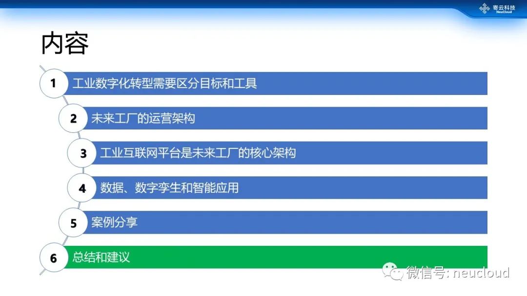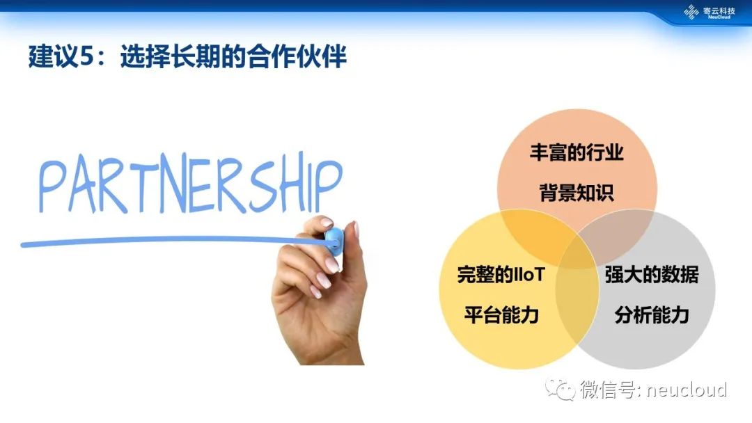 第5个建议就是选择相应的长期合作伙伴。对于合作伙伴的评估,一定要考虑它是否具备丰富的行业知识和项目积累,是否具备完整的工业互联网服务能力,是否具备强大的数据分析能力……数字化转型是一个长期的过程,在开始就要选择可靠的伙伴共同推进。