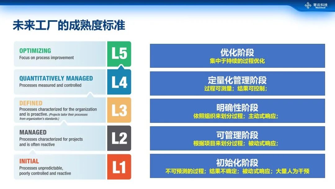 LNS调研机构还给出了未来工厂成熟度的一个界定体系,是一个从下往上的5级标准。这个体系既是对不同层次企业的划分,也是未来工厂不断演进的一个过程。