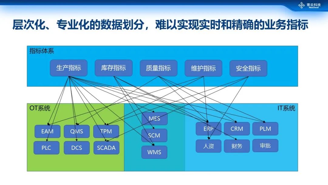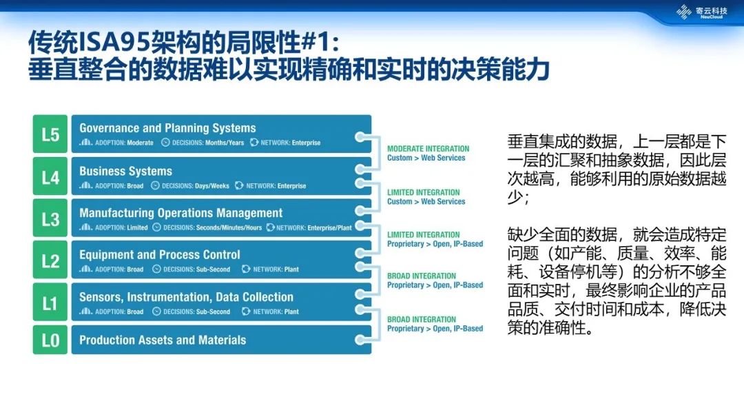 ISA95这种层次化的架构虽然很清晰的定义了每一层的工作内容,但实际上大家可以看到,在这种从底层到顶层的垂直整合模式下,每一层获取到的数据都是上一层的汇聚和抽象,底层的数据很难被顶层的决策以及生产服务直接使用,这就造成层次越高能利用到的原始数据就越少,进而发生因多次数据汇聚导致的失真、滞后等后果,最终导致企业运行效率降低。