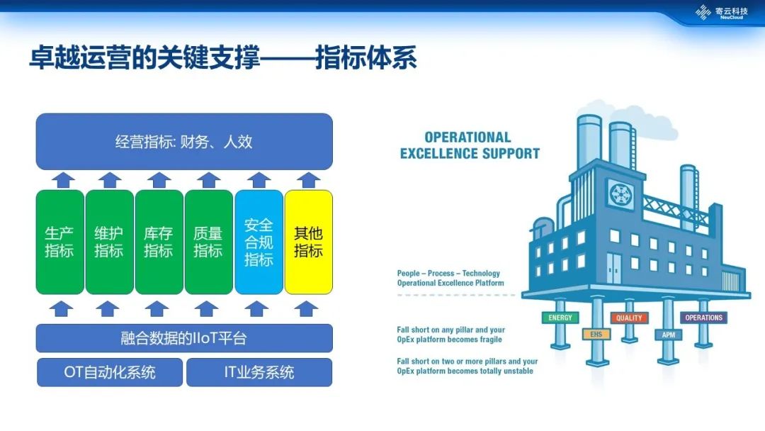 卓越运营的关键支撑就是指标体系,这些KPI指标从企业经营层面来看包含各种财务、人效指标,再往下可能就划分到不同部门,诸如生产指标、维护指标、库存指标、质量指标、安全合规性指标,以及相关的一些业务部门的指标,这些指标应该来自于基于平台对接的各种自动化系统数据和业务系统数据。