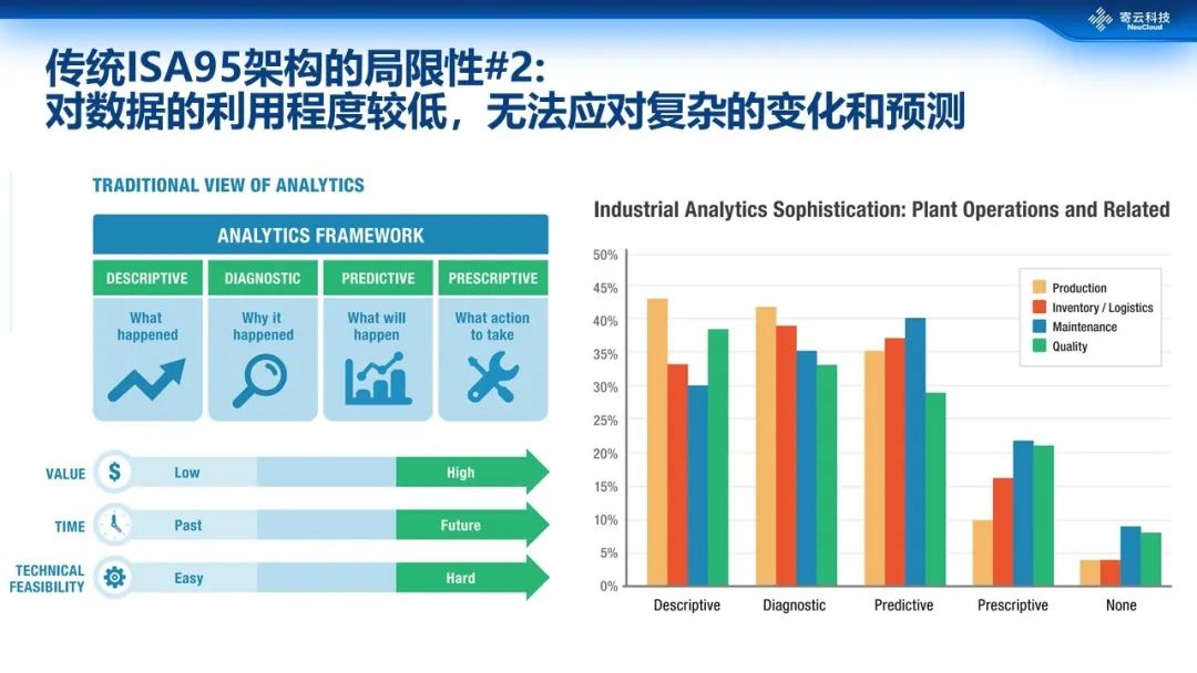ISA95的第2个局限性是企业对数据的利用率和利用程度还非常低,一般来说数据分析包括描述性、诊断性、预测性、预知性等,但据调研机构调研显示,其实绝大部分企业对数据的利用只是停留在一些初级描述性descriptive层次,其实就是一些统计报表。高级的数据利用诸如设备可靠性的预测、产能的预测,亦或者是供应链库存的预测等都还没发挥出作用。