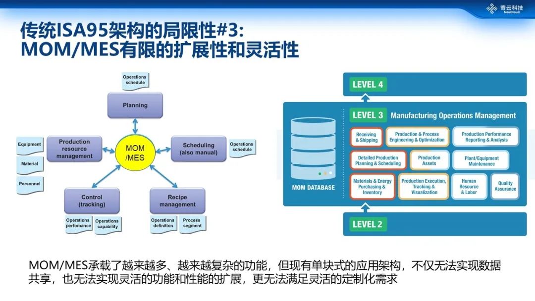 第3个局限性就是ISA95的架构体系。在现行的体系下,MOM/MES往往被做成一个大而全的独立系统去承载越来越多越复杂的功能,这种单块式、单一数据源、垂直、烟囱式系统,其实很难实现数据的共享,也很难实现功能和性能的一个扩展,更没办法来快速满足工业企业差异化的定制需求。