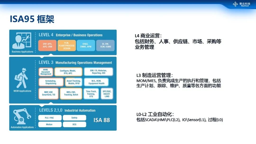 这里我们重点会看ISA95,因为它涵盖了运营支撑层面的很多方面。ISA95工业企业架构划分成5个层面,最下面三层其实是我们说的自动化层面,就是大家熟知的OT的一些PLC/PAC,以及DCS等相关的各种系统;中间这个层面是MOM,可能有些人对这个词比较陌生,但其实它跟MES是一个概念,在上层业务系统和下层的自动化之间起着承上启下的作用,所以它包括了生产计划、过程管理、维护、质量这方面的功能;最上面一层就是大家熟知的一些IT系统,财务、人事、市场这些。