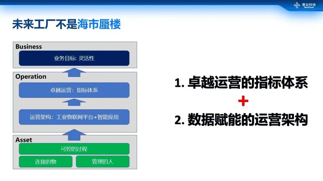 未来工厂并不是一个虚无缥缈的概念,它旨在指导现有工厂进行数字化变革,使其能够在运营等层面得到巨大的提升。运营层面其实主要是包括两方面,第一、定义一系列卓越运营的指标体系;第二,打造数据赋能的运营架构,走向一个最终的卓越运营的目标。