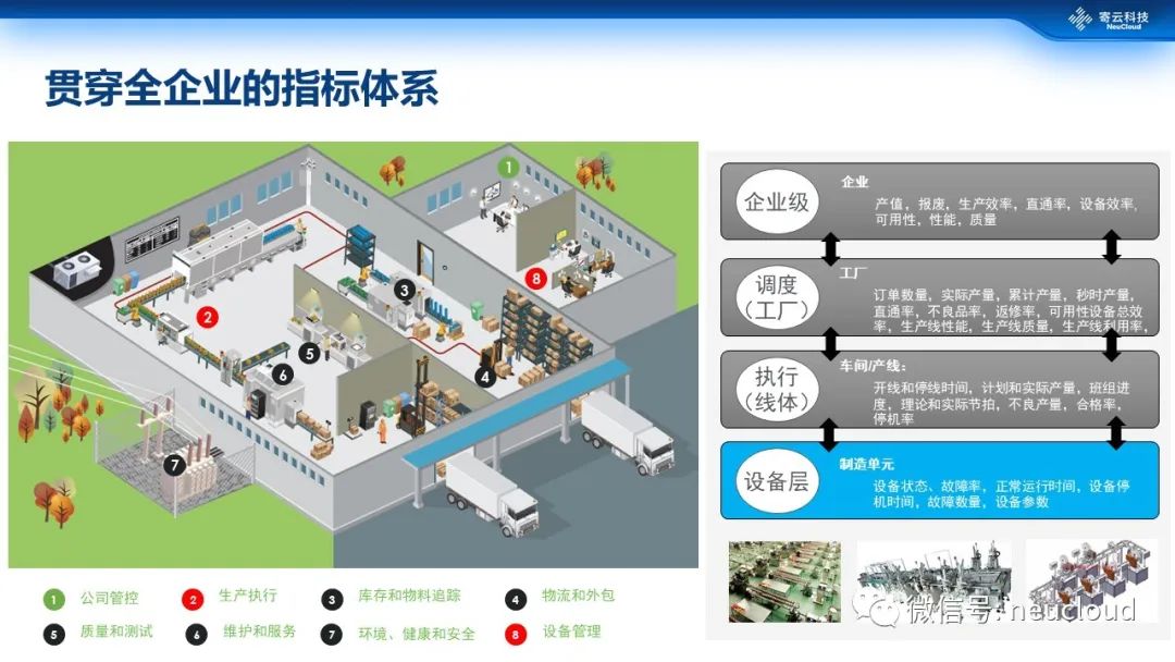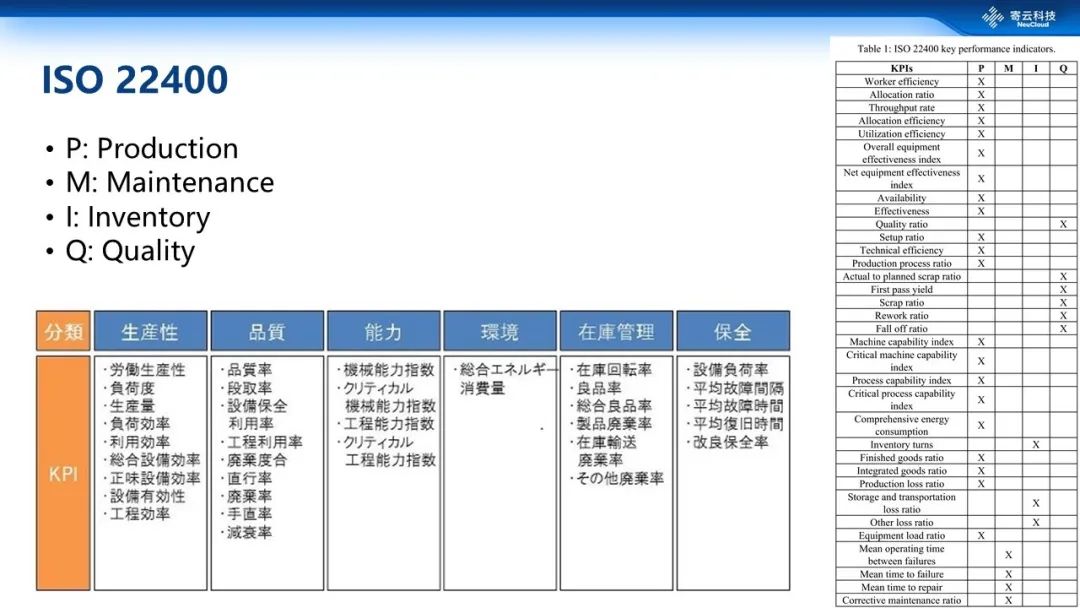 对指标体系有兴趣朋友可以参考ISO22400-2,这是一个多维度的一个指标体系,主要包括生产(production)、维护(maintenance)、库存(inventory)和质量(quality)等维度,总共在运营层面提供大概几十个指标,已经足以来去支撑大部分企业的一个正常运营。